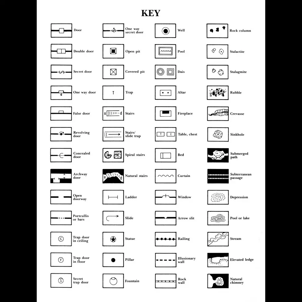 What I love most of all about the Basic Rules is the inside cover of the DM’s book which contains a key for dungeon mapping. What an amazing thing! Three columns of symbols from which you can make worlds. Encountering that as a kid was a revelation. There’s nothing better than drawing maps for D&D…