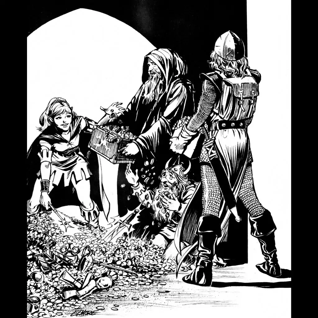 This box’s art is all Larry Elmore and he’s still in great form, delivering for my money the best depiction of a scummy D&D thief I have encountered. There’s also a badass lady with a pet tiger (not a ranger, sadly, since there are no rangers). Towards the back of the book is an illustration of a party gathering their loot – perhaps the essence of D&D in a single image.