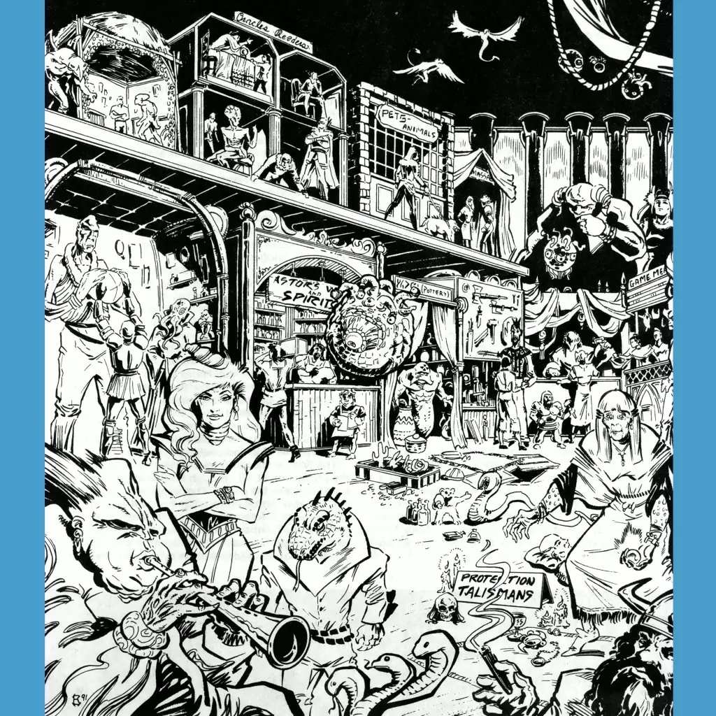 This box is a clear predecessor, conceptually, to Planescape’s Sigil and has its roots in the genre fiction convention of the multidimensional tavern, like Callahan’s Crosstime Saloon, Gavagan’s Bar and The White Hart (all of which have an earlier literary precedent in “club tales,” a type of fantastic short story, usually told by a member of a gentlemen’s club like Josesph Jorkens or even Baron Munchausen).