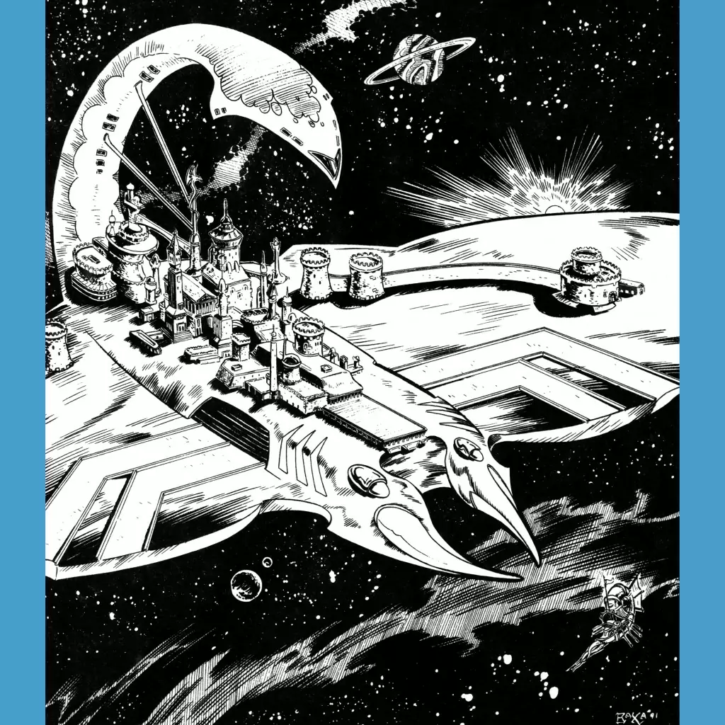 The first and largest ship in the Spelljammer campaign setting is the mysterious ship called…well, Spelljammer: a giant manta ray floating through space with a city on its back. You might have guessed that from the setting logo.