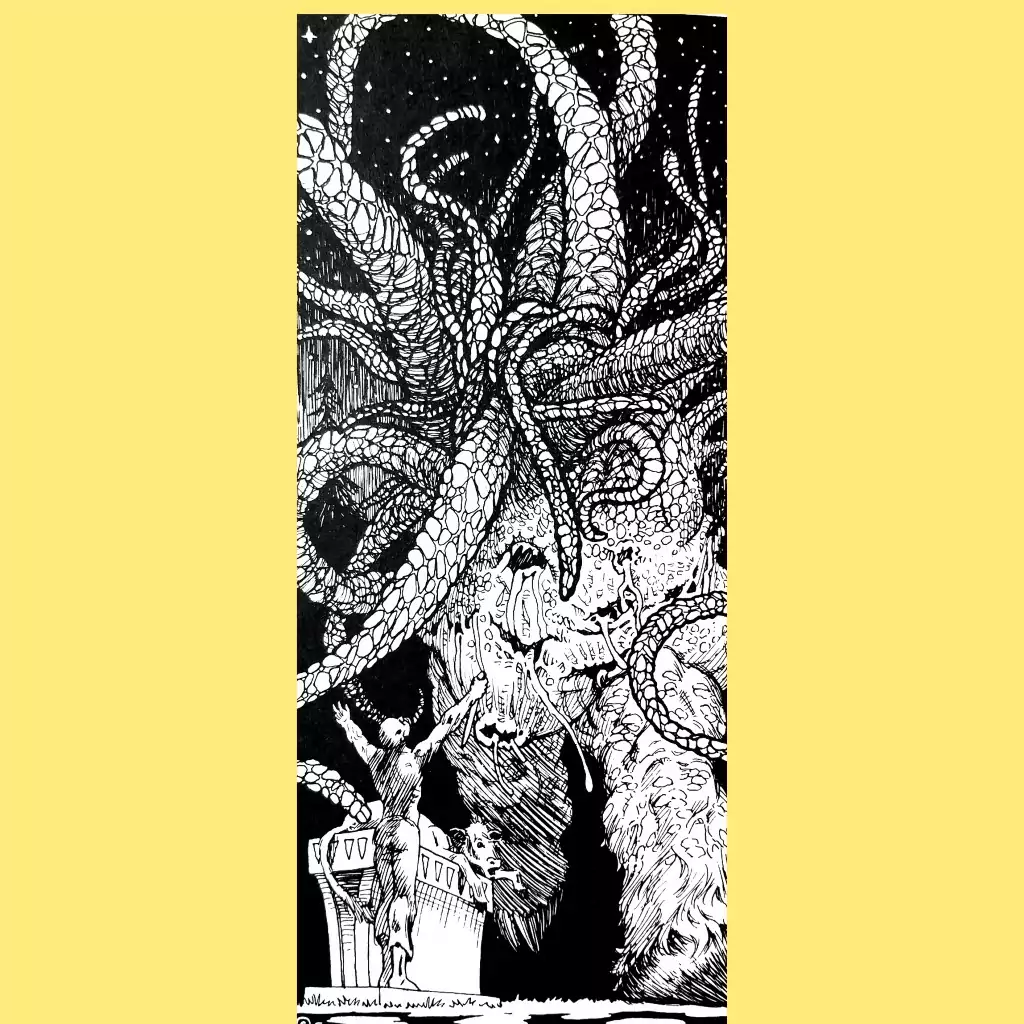 It features some classic color plates. Most noteworthy for me is Les Edwards’s totally not Cthulhu Mythos painting of the Croglin Vampire, which might be familiar, as it also graced the cover of 1990 volume of Best New Horror, Daniel Cohen’s Super-Monsters and the album cover of Krokus’ Alive and Screaming (of all places). That ghoul and Mr. Shiny the human-shaped Shoggoth, are also classics.