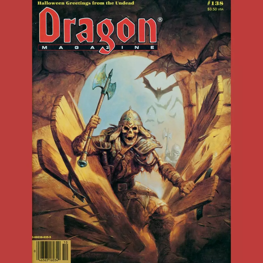 Dragon Magazine 138, the 1988 Halloween Issue, features another skeleton warrior, this time by Jeff “why does everything I paint look so puffy” Easley. I love this painting (again, choosing to see it more as a Cauldron Born from Lloyd Alexander’s Prydain books than a boring old animated skeleton). It also appeared as one of the art dividers in one of the Monstrous Compendium binders (the first or second, I am not sure which) and, because of that, it spent a lot of time in the cover sleeve of my school binders.
