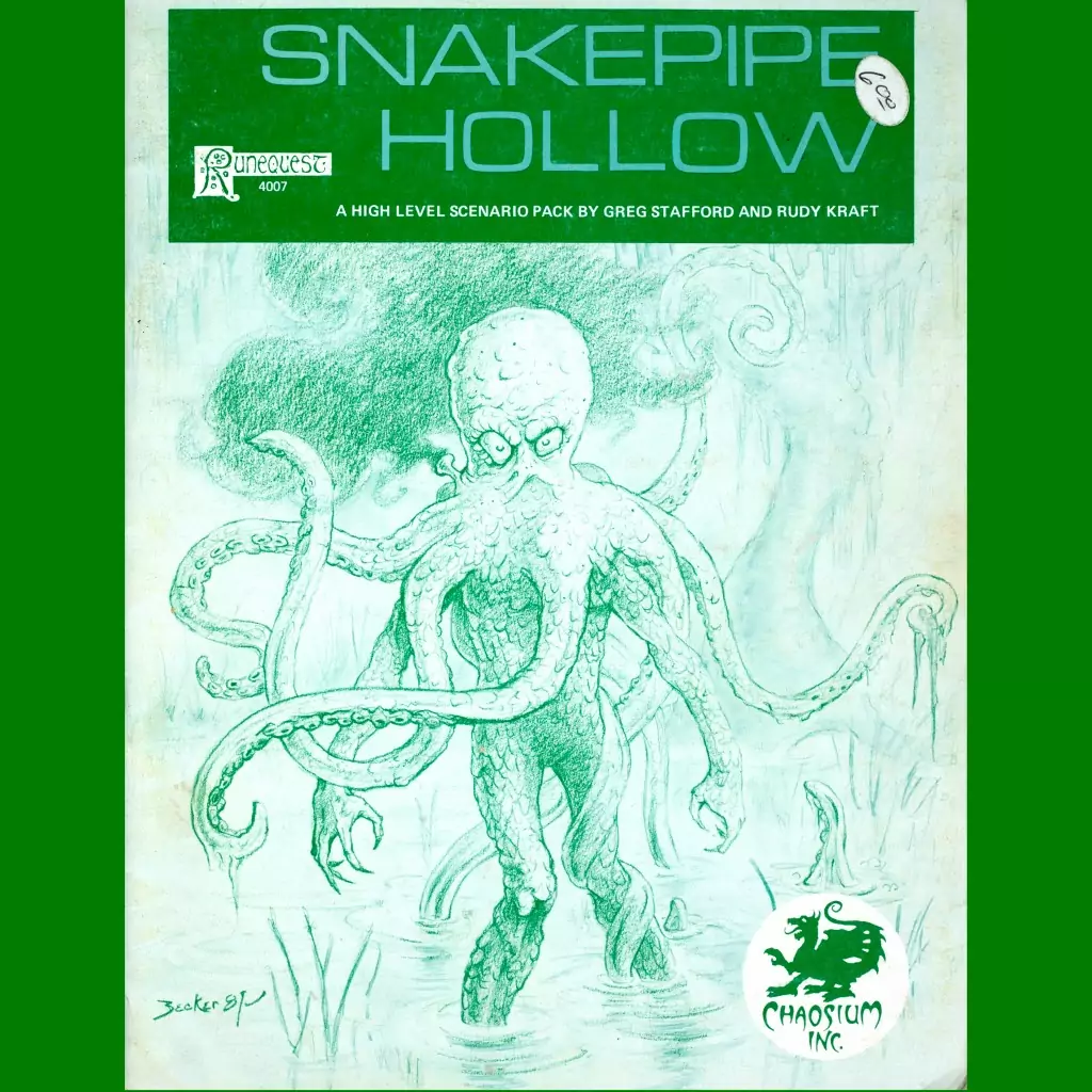 This is the 1981 reprint of Snake Pipe Hollow for Chaosium’s RuneQuest RPG. With the exception of the cover, it is identical to the 1979 version.
