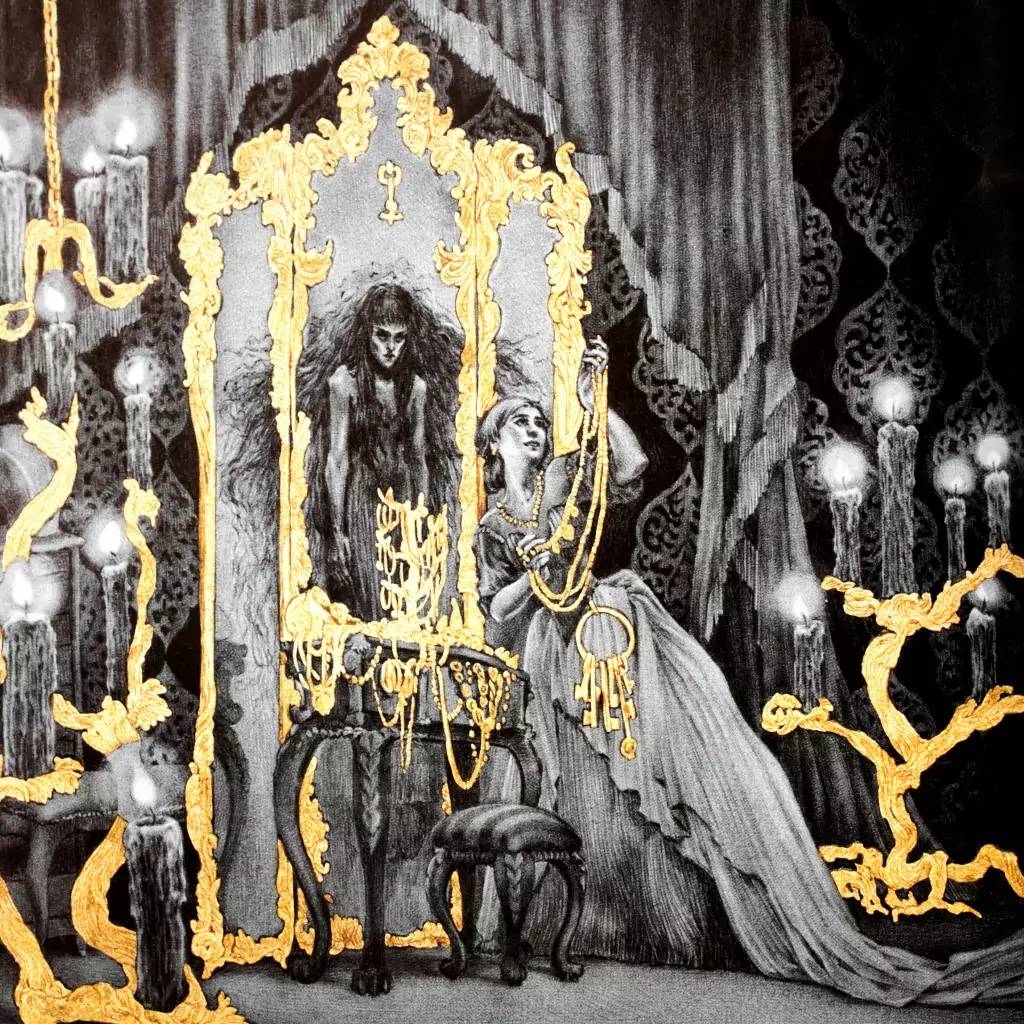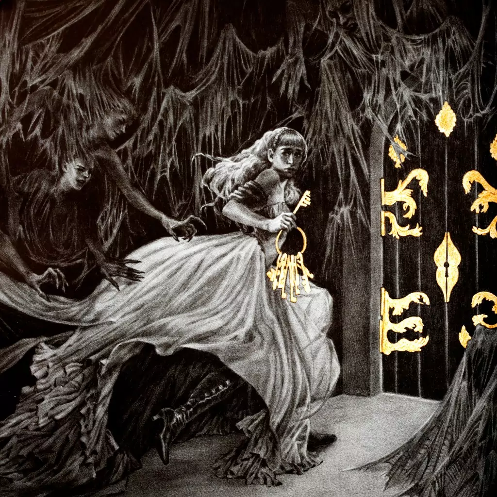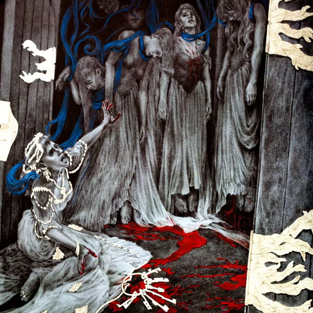 First, you need to be familiar with the fairy tale. In short, the nobleman Bluebeard marries a poor woman and brings her to his estate, where she has everything she could want. Bluebeard is drawn away on business and gives his wife keys to every room in the house, but cautions her to never open one particular door. Of course, curiosity drives her to do just that, and within she finds the tortured corpses of Bluebeard’s previous brides. Bluebeard returns and learns of his new wife’s treachery, and adds her to the abattoir.