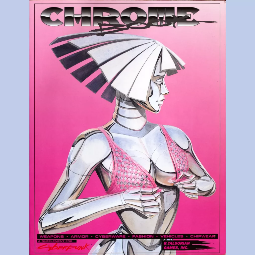The cover art, by Mike Ebert, is the most iconic bit of Cyberpunk art for me. I was actually confused when I was looking to get the rules because I thought this was the rules. Because look at that cover. It is perfect. It encapsulates the entire 80s style over substance vibe that infuses the whole game, while also visually summarizing a lot of weird stuff going on with androids that the cyberpunk genre still struggles with.