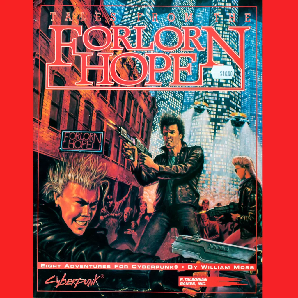 Tales from the Forlorn Hope (1991) is an 8 scenario campaign for Cyberpunk 2020 focusing on a fraternity of solos (that is, Cyberpunk merc types) and ancient history involving a ranger team during a drug war. Its aimed at starting players with the intent of forging them into a team (the notion of teams is a powerful one in a world where everyone is out for themselves – they ensure that players won’t screw over their pals; at least not too much).