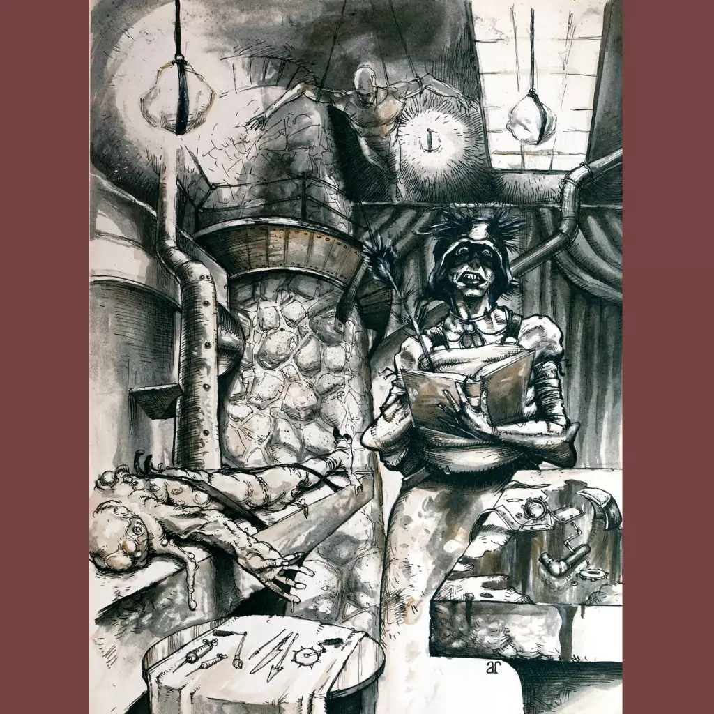 Cover art is by Randy Post, my second favorite Planescape artist. He really nails the vibe established by DiTerlizzi while maintaining his own super-intricate style. I mean, just look at that Drow priestess. Look at her! So good. We’ve also got stuff here by Adam Rex and Ray Nadeu, which are fine but they don’t really light my fire. Consolation prize – in the corner of every page is a line drawing of a monodrone, so if you flip the pages real fast it creates a walking animation. It is delightful.