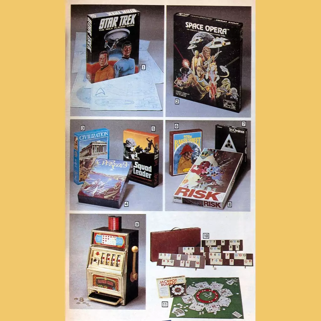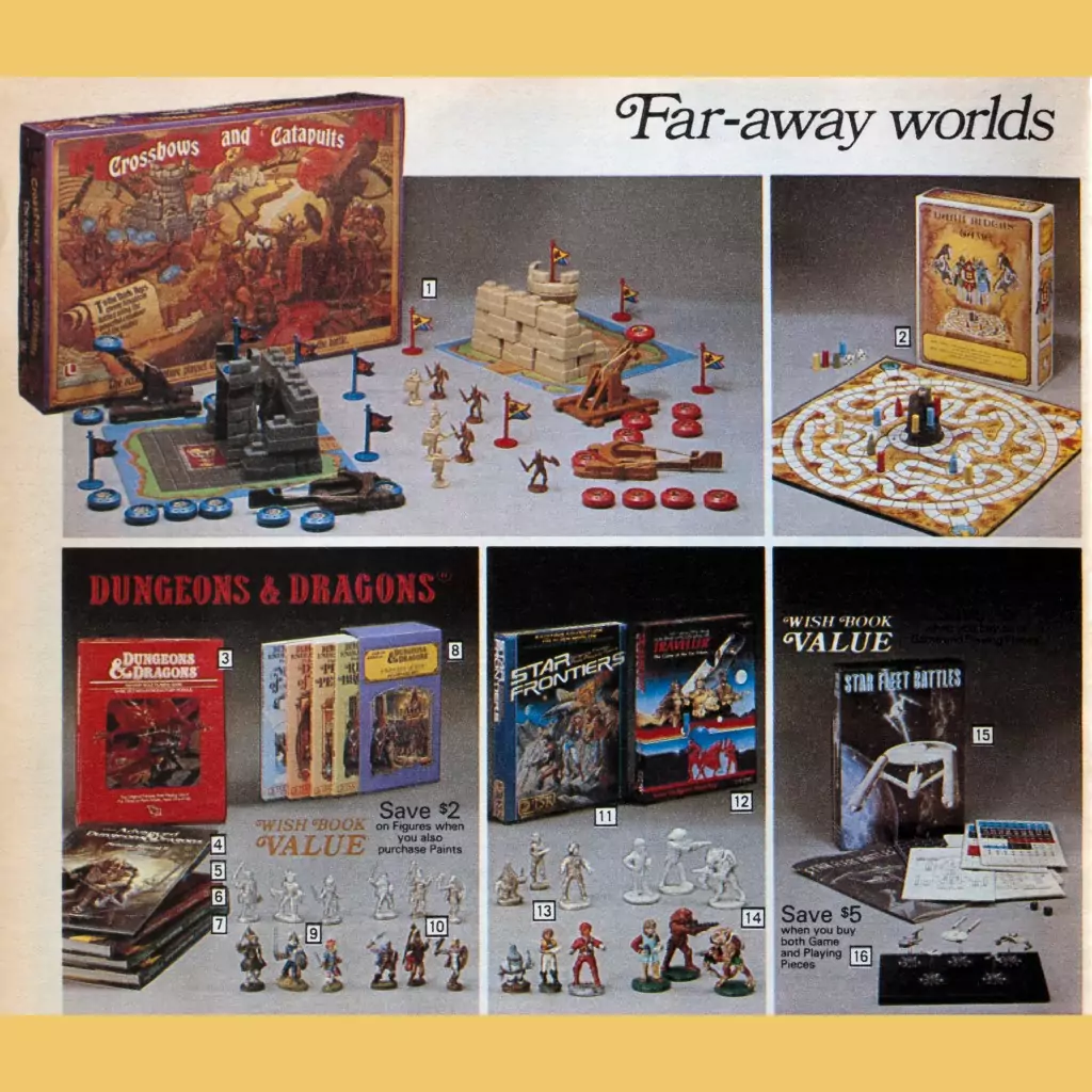 A lot of good stuff in this year’s catalog for RPG nerds, including Crossbows & Catapults, Star Frontiers, Traveller, the Star Trek RPG, 221B and Space Opera. You can definitely feel the Star Wars sci-fi vibes overshadowing the fantasy elements. I’m not too familiar with the Dark Riders board game (to the right of C&C) and the miniatures still seem like a weird inclusion, but my favorite thing is actually the core D&D books – look close. Despite having them for the photo shoot last year, this year they just faked it. That top book is supposed to be Monster Manual II if you can believe it.