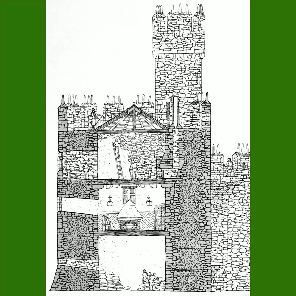 Castle is the fifth in David MacAulay’s series of children’s books about architecture and building (following Cathedral, City, Pyramid and Underground, all worth your time), first published in 1977. (You might also know MacAulay’s Hotel of Mysteries and The Way Things Work).
