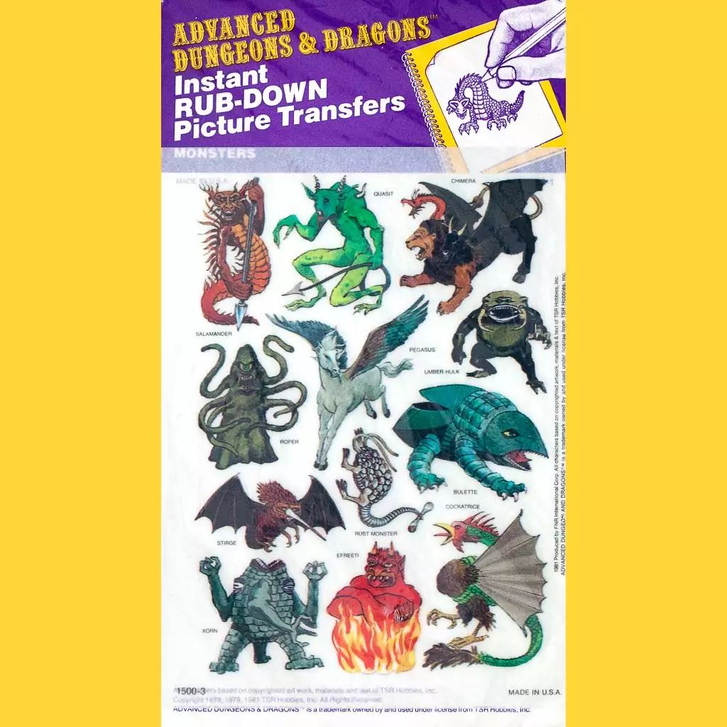 TSR produced Dungeons & Dragons themed transfers under their own brand banner, in two sets of four. This is from the first series, which reproduces creatures from the Monster Manual. Copyright says 1981, which makes sense, though these were definitely available for a few years after.