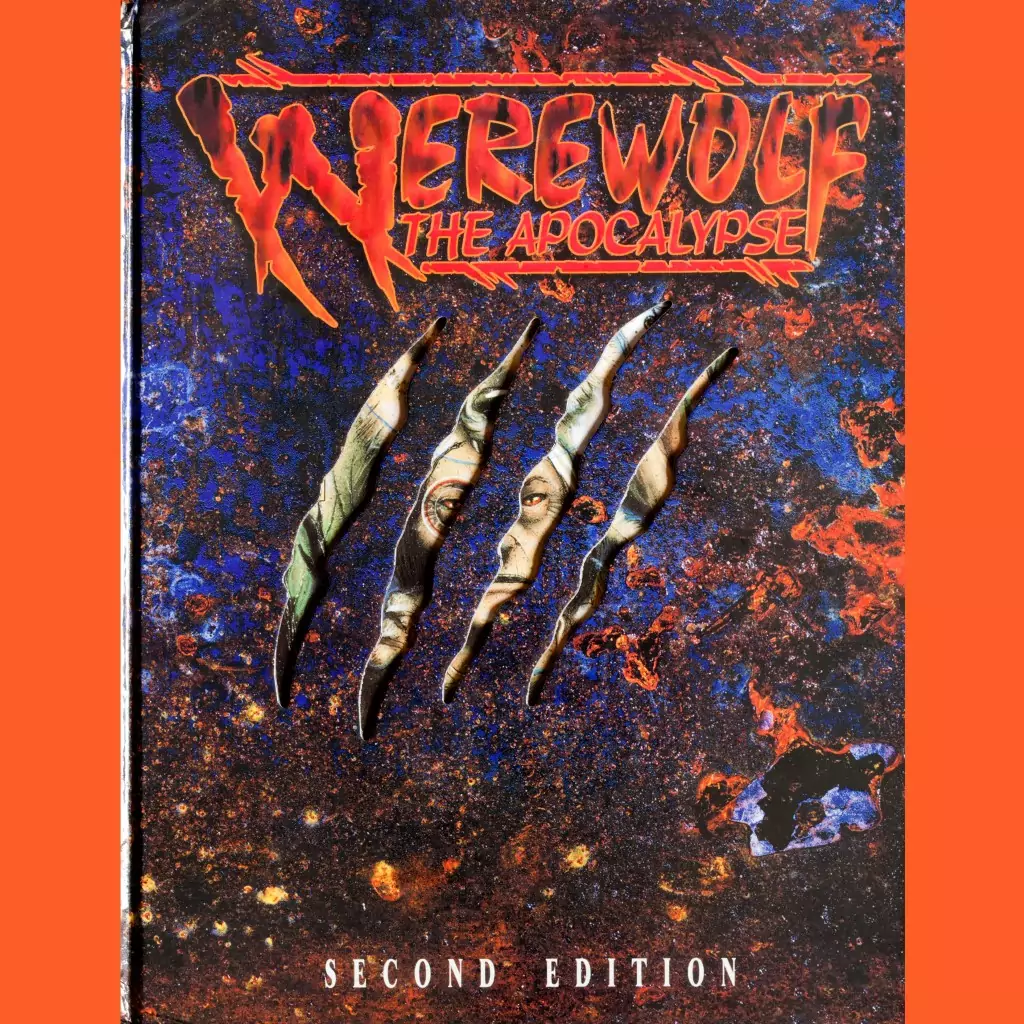This is the second edition core rulebook for Werewolf: The Apocalypse (1994). This game is set in the same world as Vampire: The Masquerade and its introduction effectively launches the larger World of Darkness idea. All the discrete systems are built with essentially the same mechanics, meaning you can mix vamps and weres if you want, which is cool, but this also required a lot of revised handbooks to be published as the rules systems were overhauled over the years.