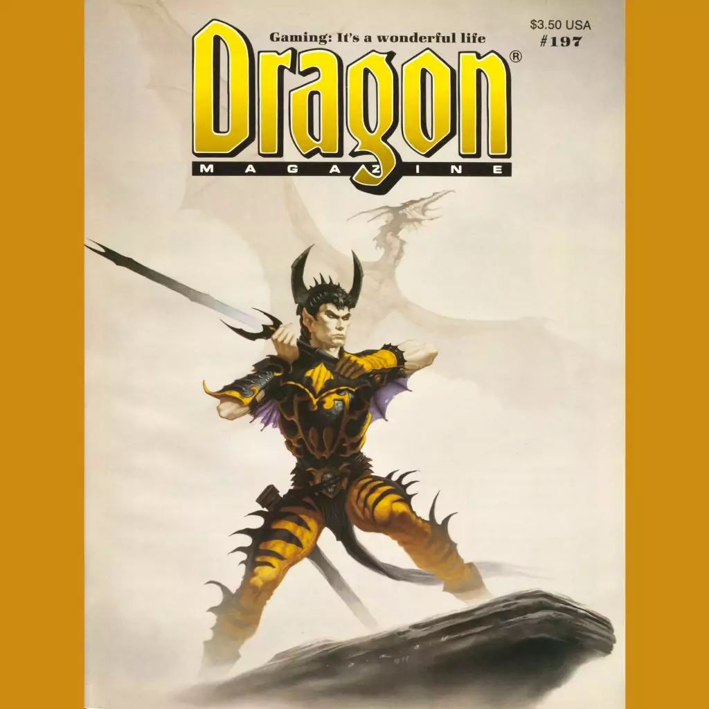 Dragon Magazine 197, from September, 1993, sports a lovely Brom painting on the cover. Granted, this is obviously an elf, but I get a lot of Melnibonean vibes. As ever, Brom’s palette and quality of light is to die for.