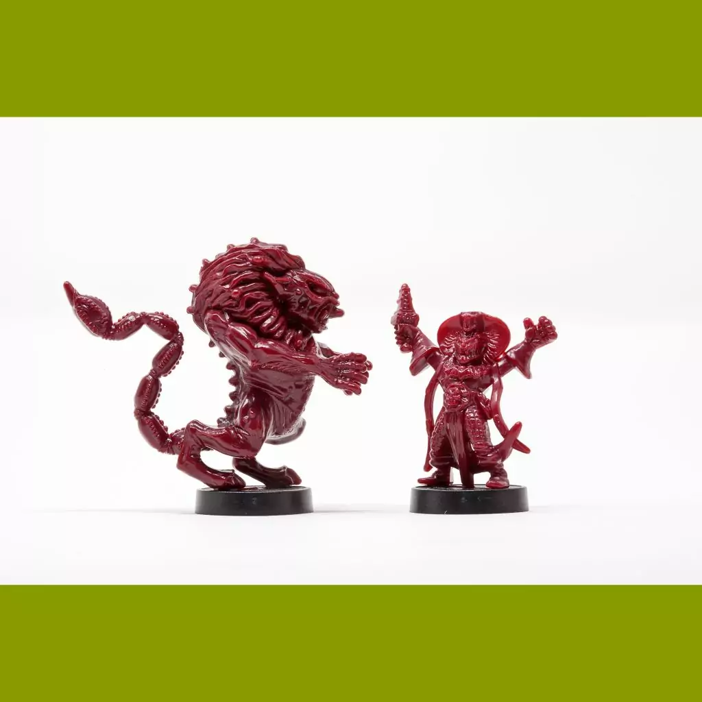 That said, boy is it pretty. A multi-room dungeon, with hinged doors, treasure chests that open and secret panels that swing, leads to a large plastic temple. The central pillar of the temple, the Mace of Chaos, is a little rattle with four balls in it that determine random play order, which is novel. If that were all, I’d be impressed. But it isn’t all. Dark World has three of the coolest miniatures to come in a board game. The grim reaper is awesome, the serpent priest is wild but man, check out that manticore. No wings, massive, creepy scorpion tail, so good, I love it. The rest of the monsters are fine, if a bit generic, and the heroes are a bit bland for my taste, but the manticore more than makes up for them in my view. YMMV.