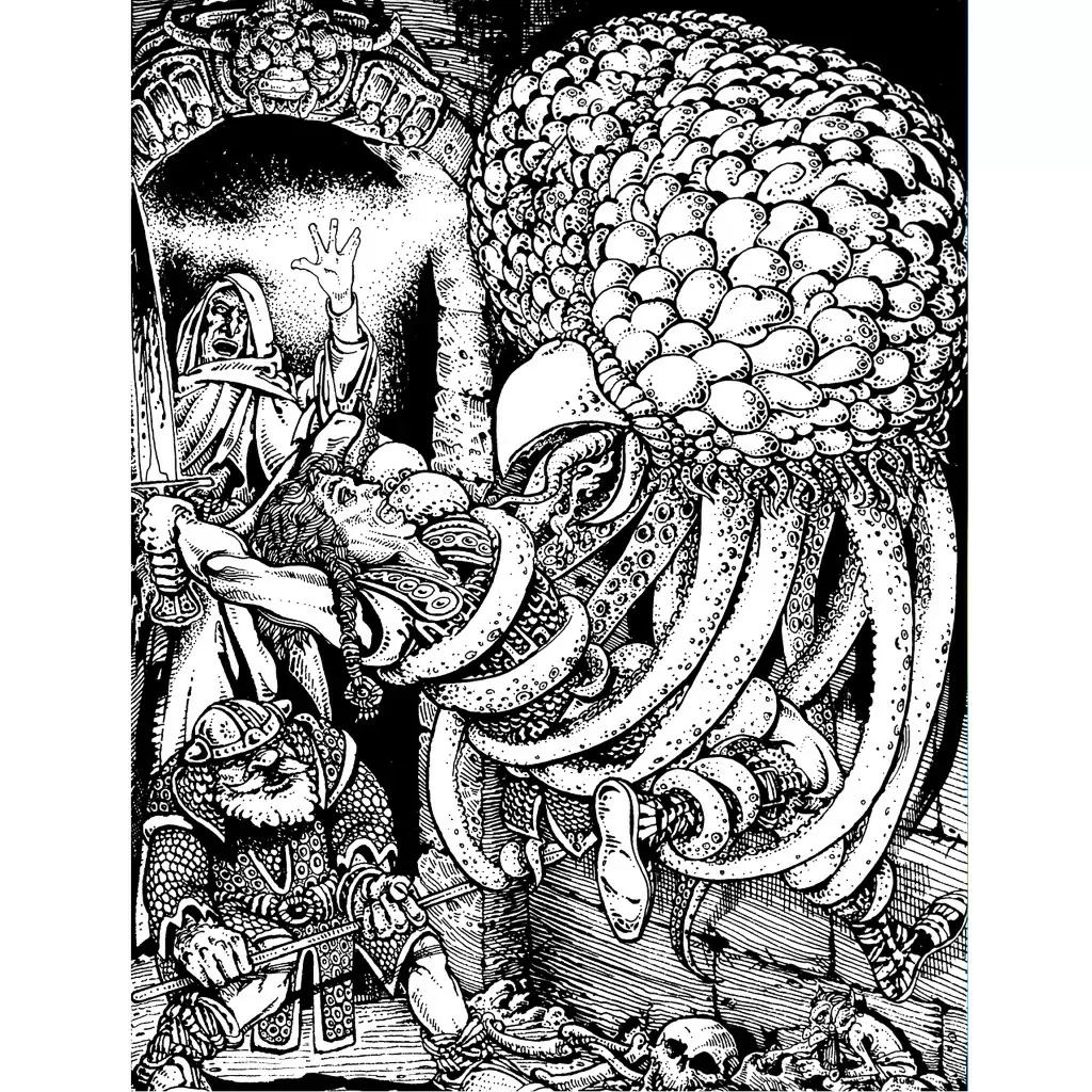 When I learned that there was a bendy Grell toy in the LJN line, I was thrilled, because the Grell, specifically Russ Nicholson’s illustration of the Grell in Fiend Folio, is one of my all time favorite D&D critters. But when I saw it for the first time, I thought someone was playing a practical joke. I still kind of do…