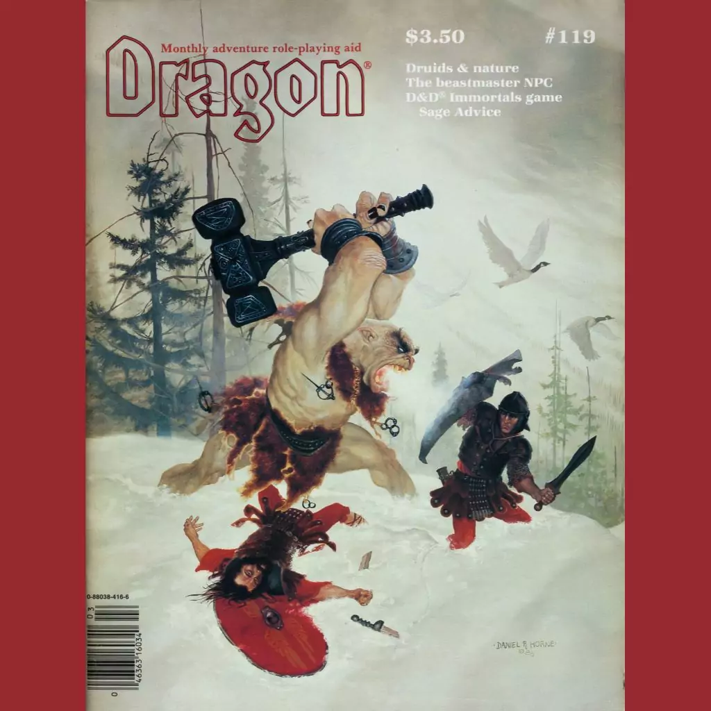 This is Dragon Magazine 119, from March, 1987. The cover painting, by Daniel Horne, is titled “The Real Reason the Romans Left Britain” and the note inside describes it as an encounter between Roman foot soldiers and the demon lord Kostchtchie. I am a little dubious about that, but I sure love the painting, especially the geese? What an odd touch. In a way, I feel like this cover anticipates Larry Elmore’s famous cover on issue 140, which would appear in December of 1988 and depicts a cleric healing a warrior smooshed by a giant.