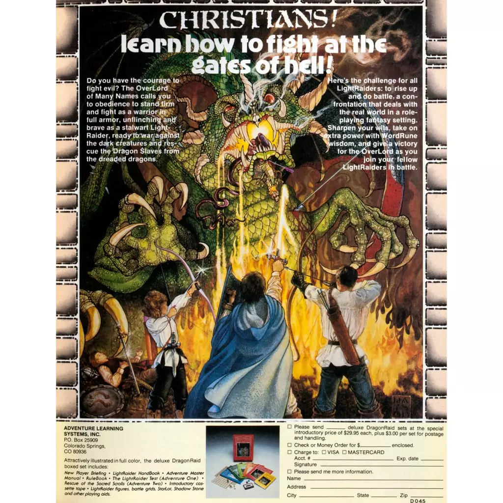 While shooting Dragon Magazines, I came across an advertisement (last slide) for Dragonraid. I had never heard of it before, but a Christian fantasy RPG released in 1984, at the height of the Satanic Panic? I had to own it. But when I turned to eBay, I found the boxes were exorbitantly expensive. After a little more looking, though, I found that current owner of the IP was still selling copies assembled 90% from the original stock. For 35 bucks. Sold! Vintage, but brand new.