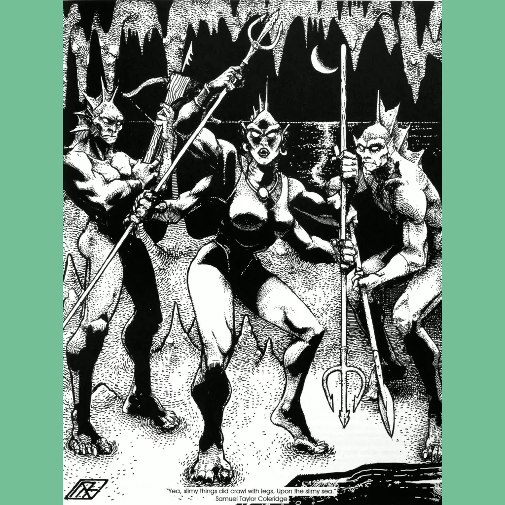 Most of the space is devoted to describing the town and its environs, as well as a key underwater cave. Basically, Sahuagin have lost a crown, a selkie found it and a whole lot of people are going to die if things don’t get straightened out. The plot is progressed through five timed events, the end of which the party will either be victorious or defeated. Even in victory, though, there are no clear winners and the problem at the crux of the adventure is unlikely to be resolved with any sense of permanence.