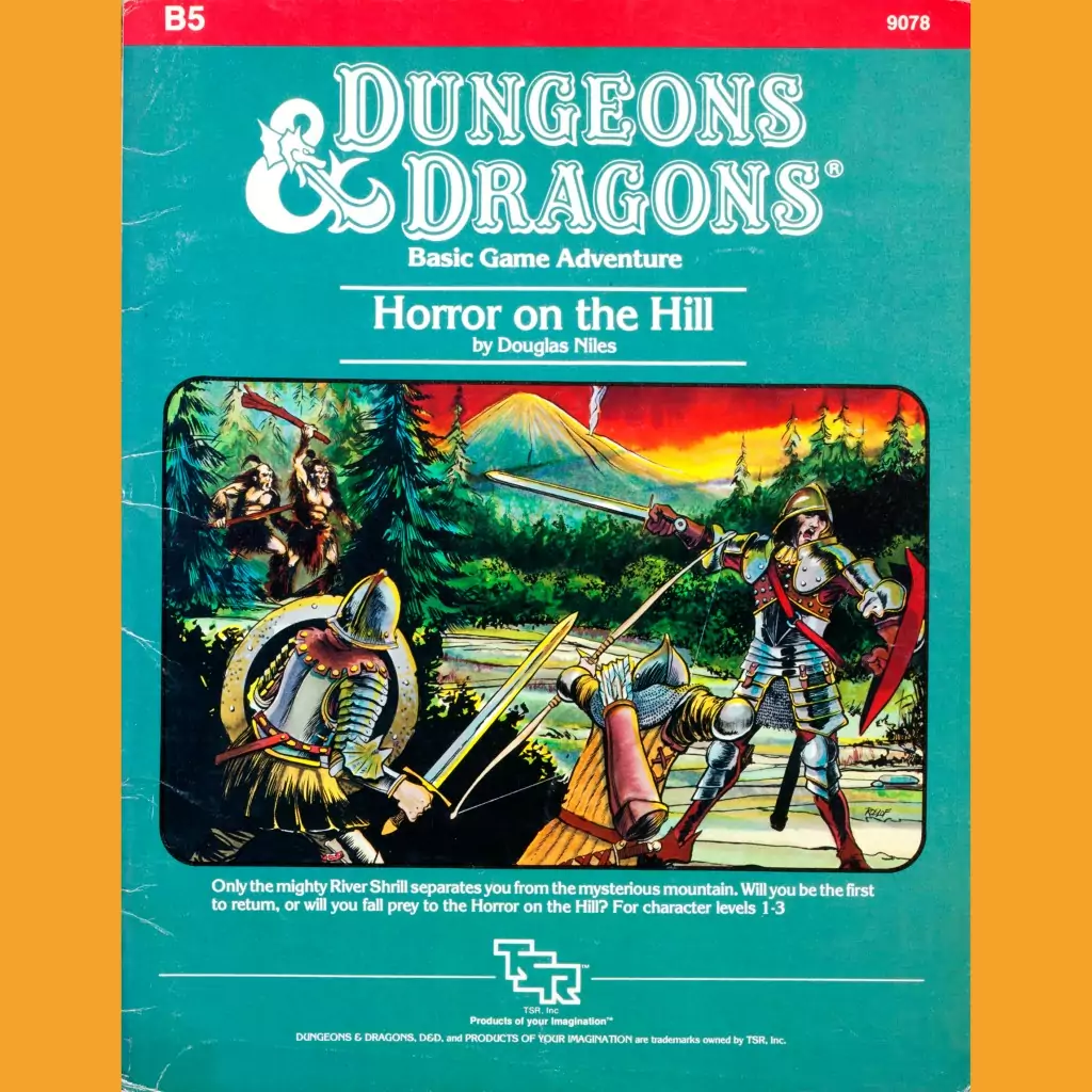 B5: Horror on the Hill (1983) was the first original Basic module to come out in support of Mentzer’s Red Box basic rules. There’s a volcano, some wilderness encounters (which is weird for a Red Box basic scenario), an abandoned monastery and a cave system. The main antagonists are a tribe of goblins and hobgoblins, though there’s a young red dragon and some owl bears and other surprises. Mostly, though, this one feels like Keep on the Borderland Lite to me. There is nothing in the module that, to my eye, justifies using the word horror in the title, either.