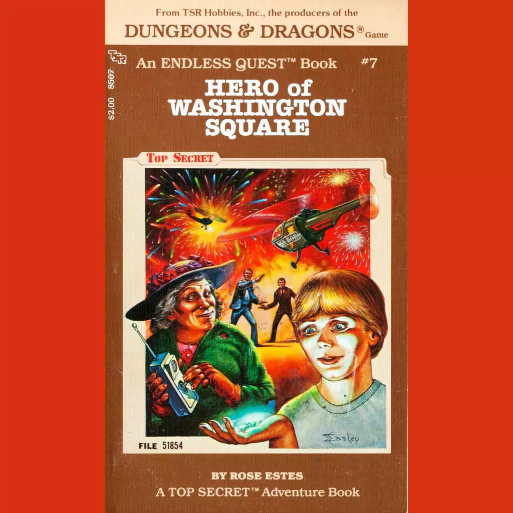 Right, here’s where Endless Quest gets a bit more interesting. Not content to just put out children’s interactive fiction as a gateway drug to Dungeons & Dragons, Hero of Washington Square (1983) marks the series first foray into other TSR RPGs, in this case Top Secret. It is the seventh book in the series and the seventh book by Rose Estes, who, gods bless her, must have cranked these out with wild abandon because at this point the series was just 11 months old.
