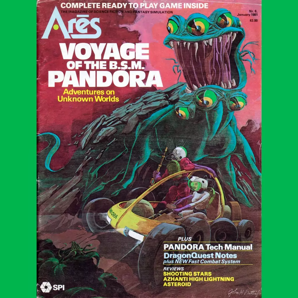 Annoyingly, I don’t own Ares 5, but I do own Ares 6 (January, 1981) and this is it! It includes the game Voyage of the BSM Pandora, which is a prequel to Wreck, from issue 2. The artist of that amazing cover, John Buttefield, also apparently designed the game. I can’t find any more of his work, which is a shame. Real excellent pulp sci fi energy here. More googly eyed aliens, please.