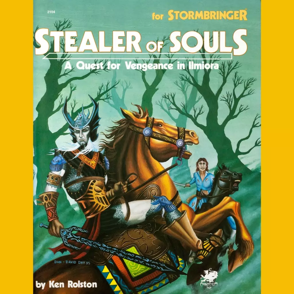 Stealer of Souls (1985) is the first part of a two-part adventure for the Stormbringer RPG. Unusually, the events of the adventure are woven around the aftermath of the Michael Moorcock story of the same name.