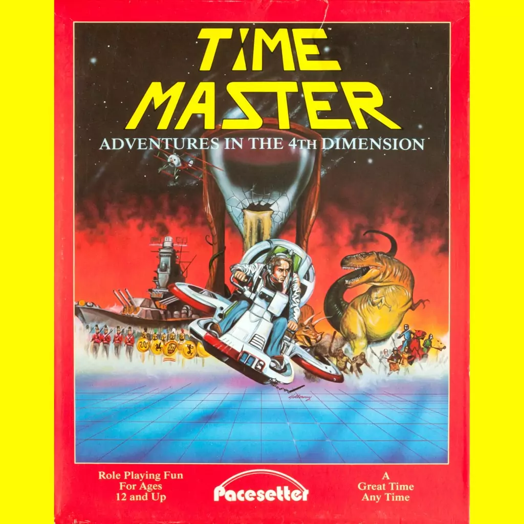 Timemaster: Adventure in the 4th Dimension (1984) is a step up from Time and Time Again. The red and yellow box is bold. That Holloway painting really screams “Time travel!” Dinosaurs are obviously involved, which is never a bad thing. The box even just straight up propositions you. “A Great Time Any Time.” Really, Timemaster? Really?