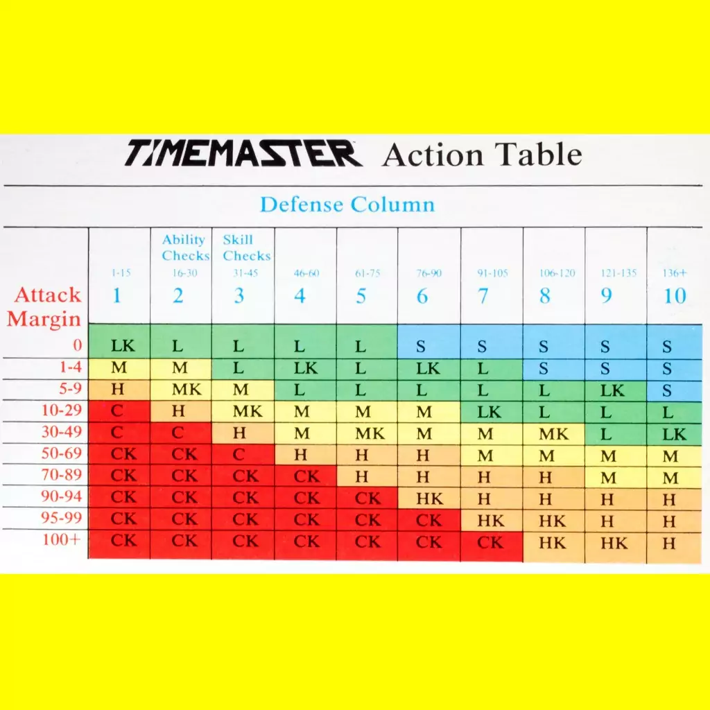 Anyway, the idea is you’re part of the Time Corps, tasked with repairing damage from to the time stream, either lingering from the Time Wars, or new problems created by renegades or Demoreans (four-armed aliens who are mucking things up for mysterious and hostile reasons. Players can be from anywhere in history — the Time Corps plucks its agents out of the time stream, where they stay, never to return to their regular lives. Thinking about it, Timemaster seems like a bit of a post-war sequel to Fritz Leiber’s The Big Time (1958), in which the mysterious Spiders and Snakes fight the Change Wars using soldiers pulled from the time stream. I like it even more now.