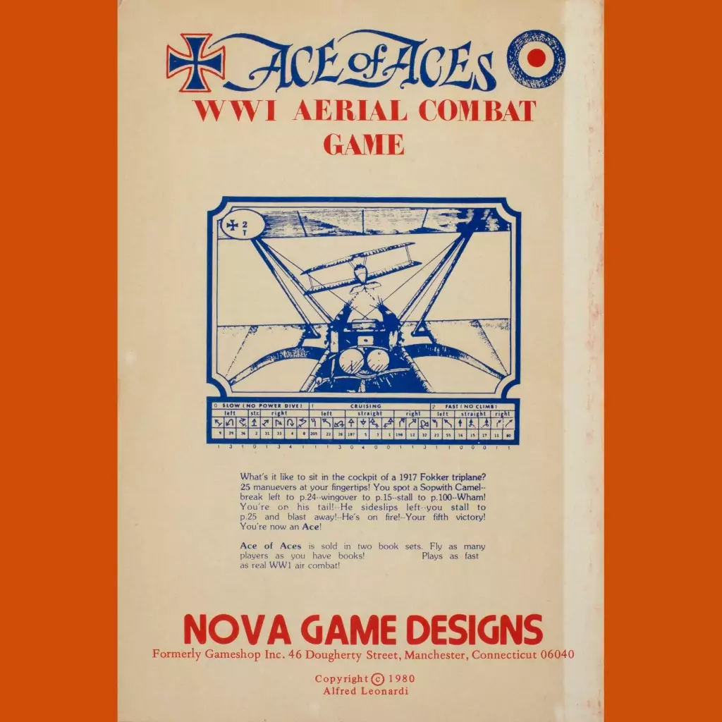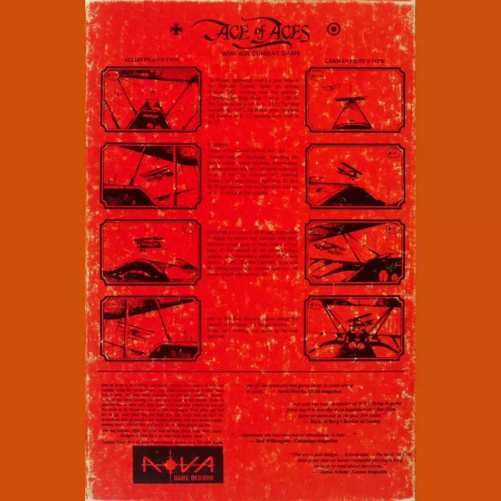 Ace of Aces is a genius idea. It’s a box containing two books, one for the Ally plane, one for the German plane. Each book contains a mind-boggling number of illustrations of a cockpit from a first-person perspective (always locked on the enemy plane) and, by calling out the numbers at the bottom, you “perform” dogfight maneuvers. And that’s basically it — use the books to fly around and try to shoot the other player out of the sky. A two-player analog flight simulator.