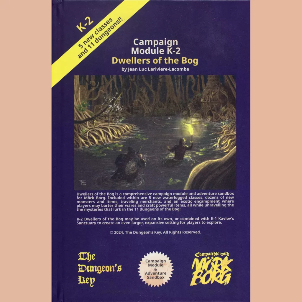 K-2: Dwellers of the Bog (2024) is the sequel/companion to Kavlov’s Sanctuary. It’s structured similarly — classes, safe hub settlement, wilderness, dungeons — though I do think the dungeons are a shade more complex and interesting in this go around. Taken together, the two books provide a hefty environment for exploration.
