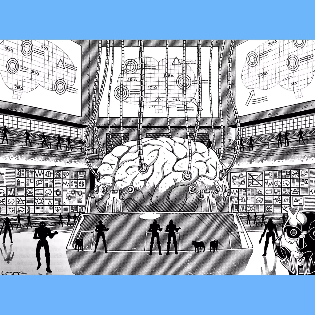 Lots of material on Triax, the German arms manufacturer, which boils down to a guns chapter. There is a selection of monsters, rules for Bot characters. The “botweiller” is introduced. Also ARCHIE, a giant brain in a jar (er, pool?) that can build all sorts of machine horrors/wonders, but lacks the imagination to come up with designs. So it needs a partner. In this case, Hagan, the fellow on the cover, who is ARCHIE’s literal idea man. I kind of love this? Even if the botweiller is one of Hagan’s ideas.
