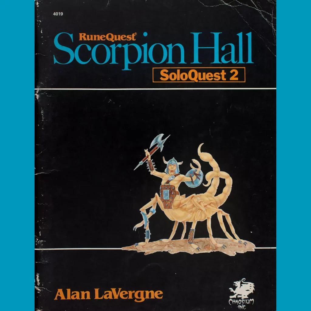 SoloQuest 2: Scorpion Hall (1982) is the best of the three RQ solos. Unlike the previous volume, this is all one scenario. As with that book, Rick Becker delivers a cool little illustration for the cover, this time of a horrible scorpion man. He even has a couple interiors! I love the naga.