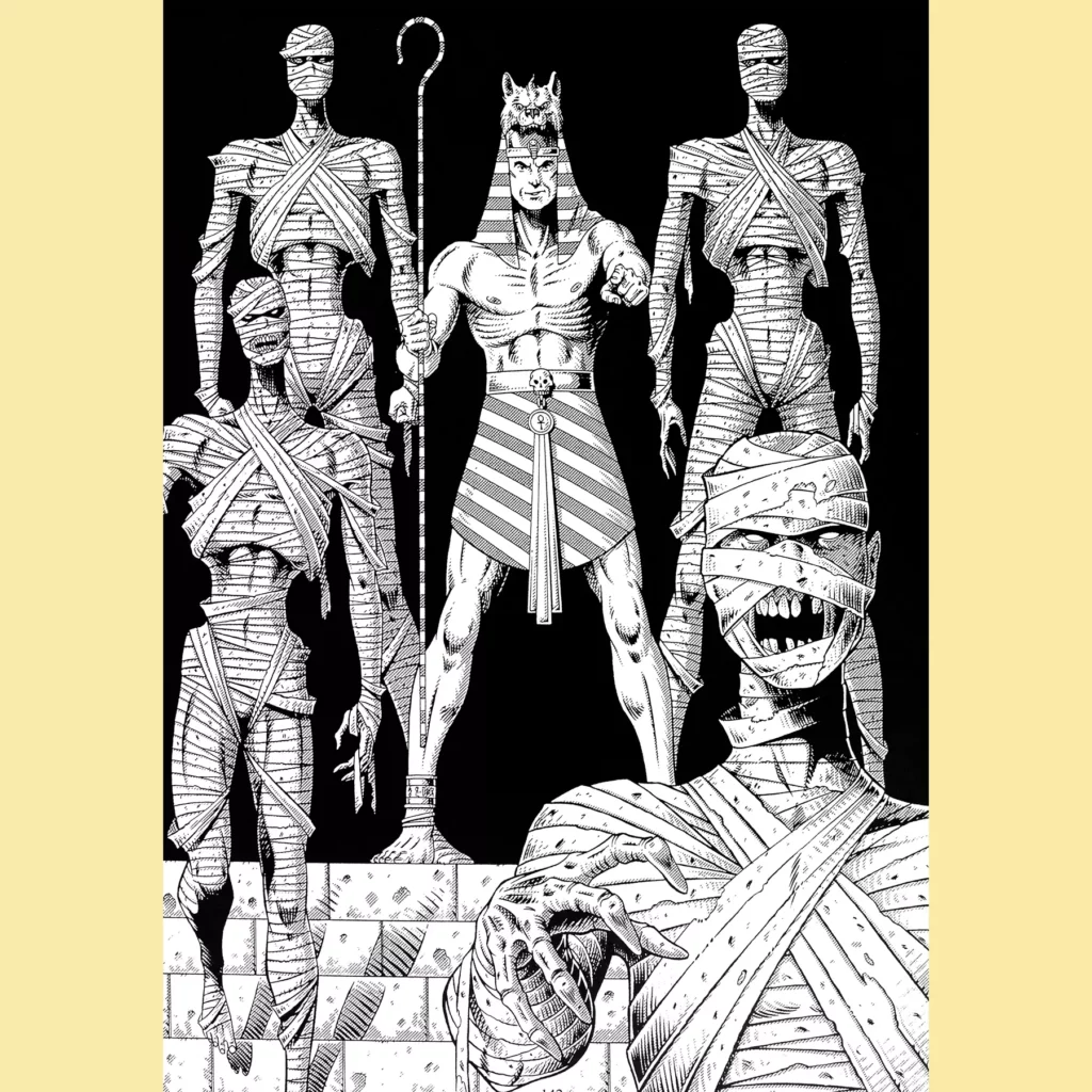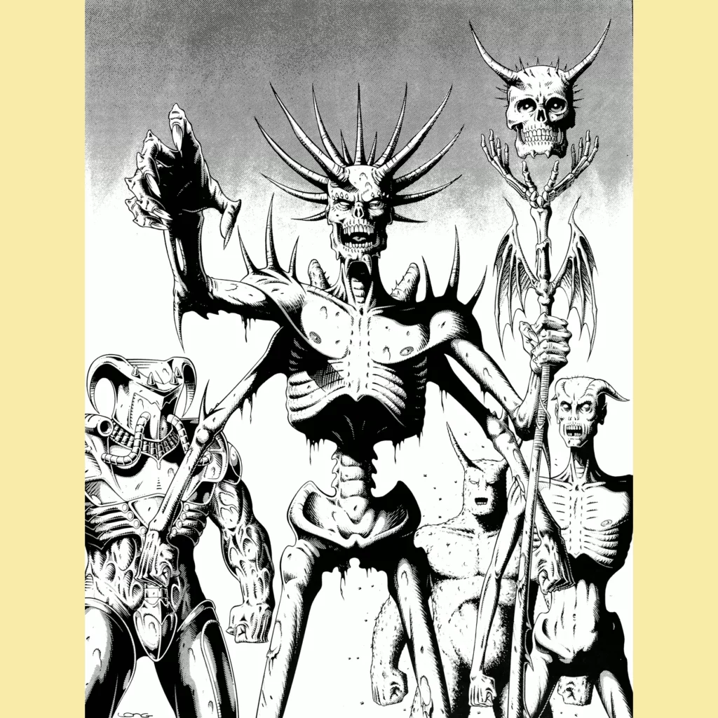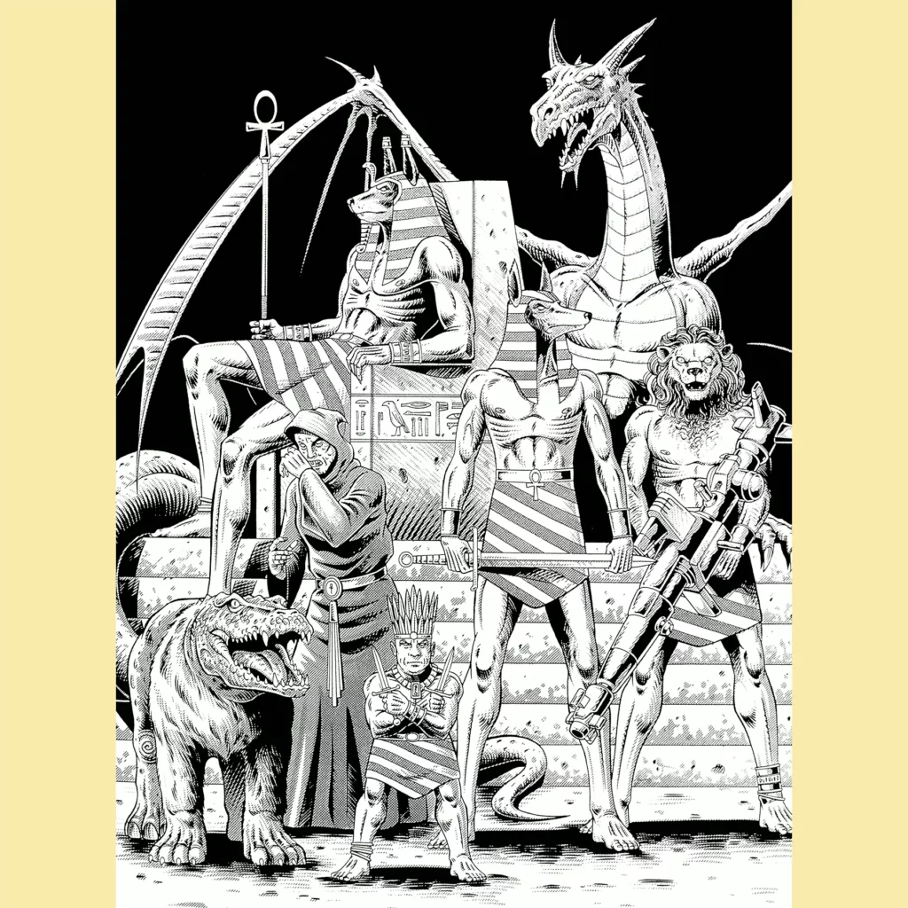 The real star of the show, though, is the introduction of the four Horsemen of the Apocalypse. They are all presented in typically over-the-top fashion (though given plausible weight thanks to Kevin Long’s illustrations). They’re spread out on the African continent, doing their individual things while also seeking each other. Should all four meet, they will fuse into a giant apocalypse beast that will destroy the world, so the book suggests that the players find and destroy the horsemen before that happens. Truly, a wild scaling of power going on here.