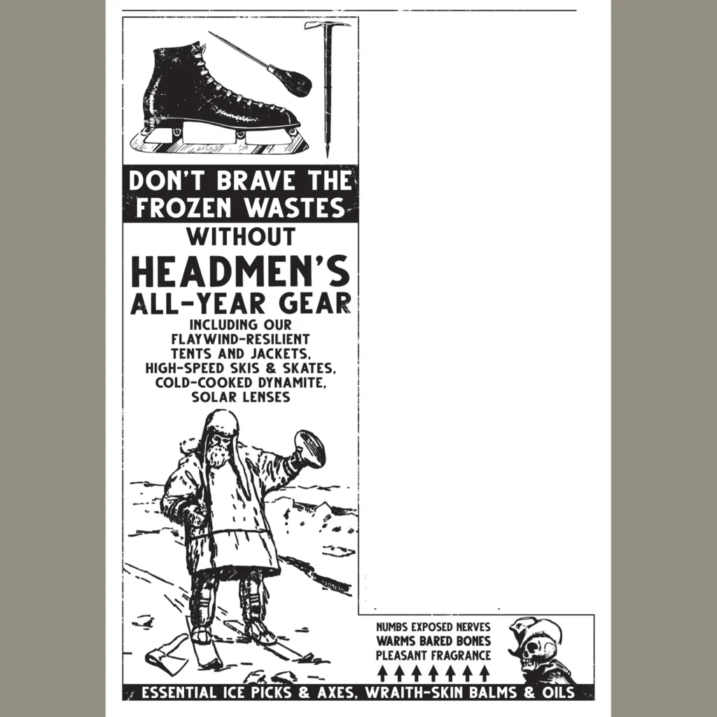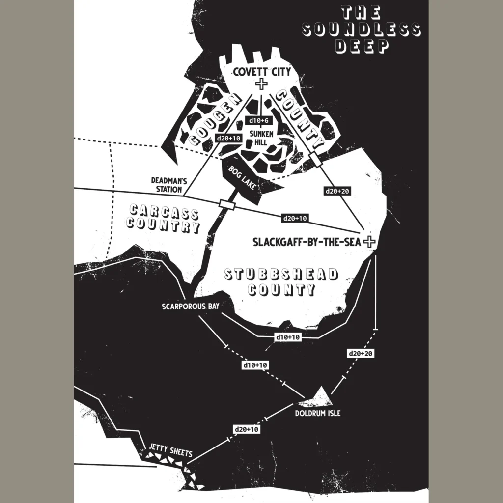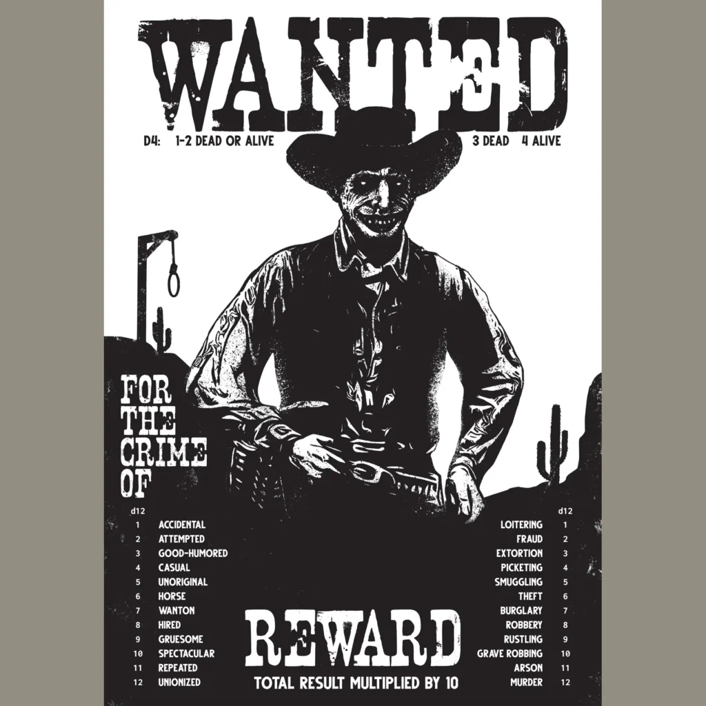 The game is Mork Borg-ish. That applies to both system, attitude and, to an extent, aesthetic. Filter Johan Nohr’s design work through 19th century newspaper ads and you’ve got the basic feel. There are tables galore (my favorite is the Wanted table: 1-2 is dead or alive, 3 is dead, 4 is alive) of course, all of which carry a good deal of the game’s world building and humor. It very much seems like watching a Western through a distorted lens.