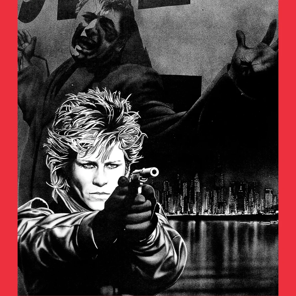 This is Kanawa Personal Weapons (1991). No surprise, this is a catalog of firearms and, for the most part, it’s just that. It doesn’t give that same look into the world the way I feel Chromebook or Street Samurai Catalog do. But I do think it neatly encapsulates the Torg experience. For starters, that orange! That trade dress! Those weird screws on the logo that somehow has a late-’70s/ early-’80s sci fi vibe! There’s a lot of promise there, I think, of both mystery and quality. But that cover painting. Which, let’s be clear, Peter Heer’s skill isn’t an issue. The fact the Bon Jovi there is holding one of the least impressive pistols imaginable on the cover of the small arms catalog is a bit of head-scratcher. And what’s with the red drapery? I’ll tell you! It’s not drapery at all, but rather, the painting is a collage combining Mr. Jovi with a city skyline (possibly New York?) and the looming image of a man who looks like a finance guy or politician who seems upset at having been crucified (honestly, though, you get into certain kinds of work you can’t be upset about the predictable consequences of that work). It’s reproduced in full inside, for some reason. It’s a lot! And we’ve only opened the cover!