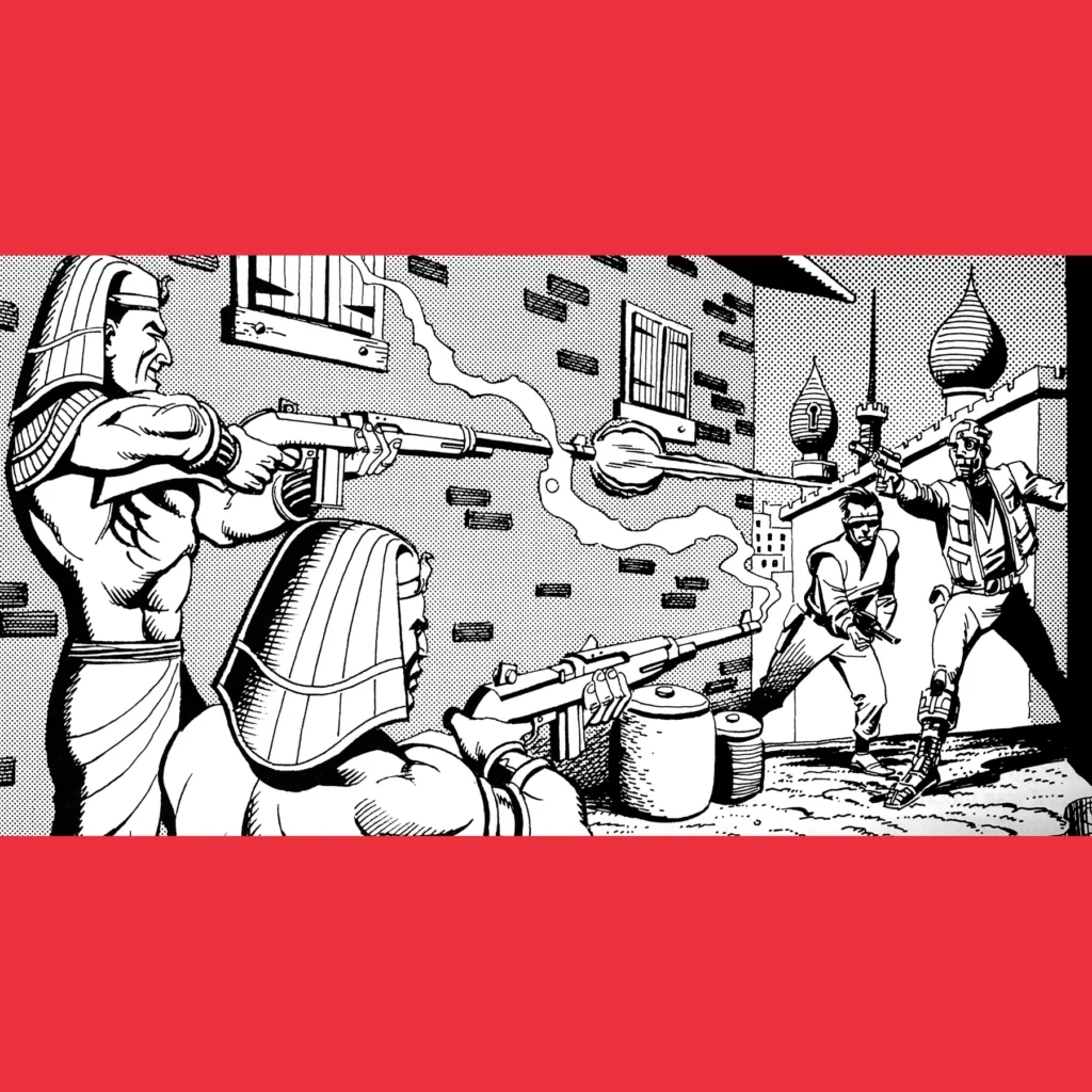 1. Those interior illustrations are great. I particularly like the commando getting ready to shoot the Renaissance wizard. Shells vs spells.