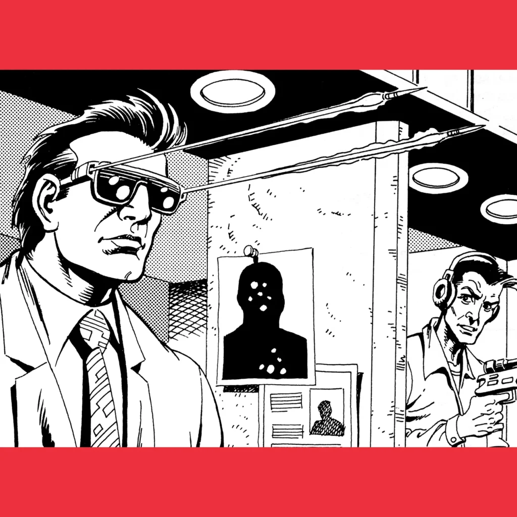 There are some weird guns! Weird here ranging from the 007 Paintball Gun to the Sparrow Fang implanted finger gun. There’s an umbrella/dart gun and a microwave gun disguised as a flashlight, but the very best is the Yamaguchi “Killer Shades” which is just…perfect. Even the text is unsure whether to take them seriously.