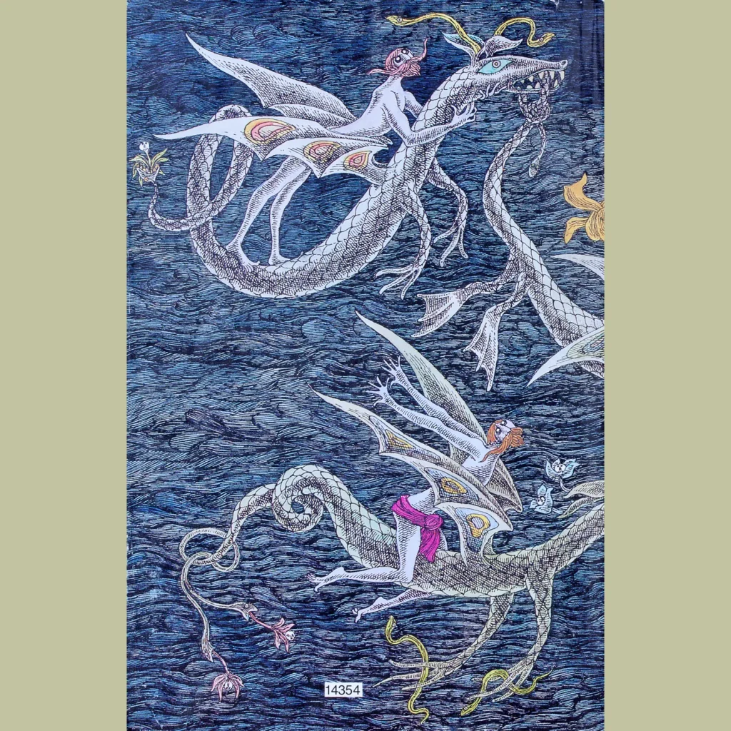 This is Edward Gorey’s most whimsical of the Kaye covers, I think — a plethora of silly sorcerers on dragonback, flying to sabbath, a bunch of nudie weirdos. Again, sort of unusual for Gorey in the choice of colors, which are both bright and varied. There’s a ton of patterning too, in the scales and wings of the dragons which I love — I feel like one of the secret appeals of Gorey is his intricately detailed wallpapers, and it is neat to see that applied to a monster.