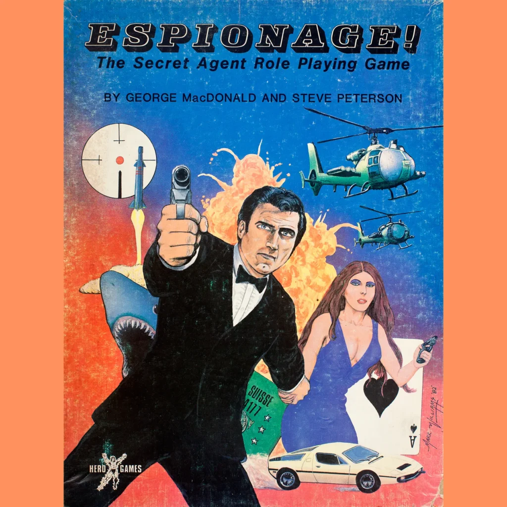 Espionage! (1983) is the second RPG developed by Hero Games, the makers of Champions. It essentially shares the same system as the superhero game, which makes this really Hero Games’ first step toward building their universal ruleset, the unsurprisingly named Hero System.