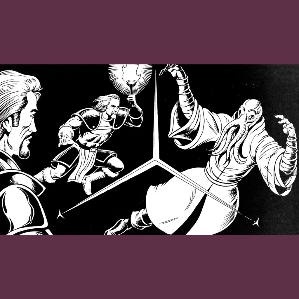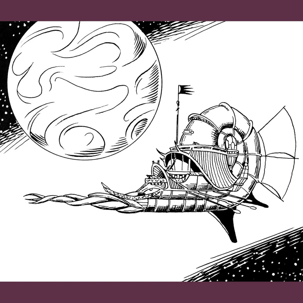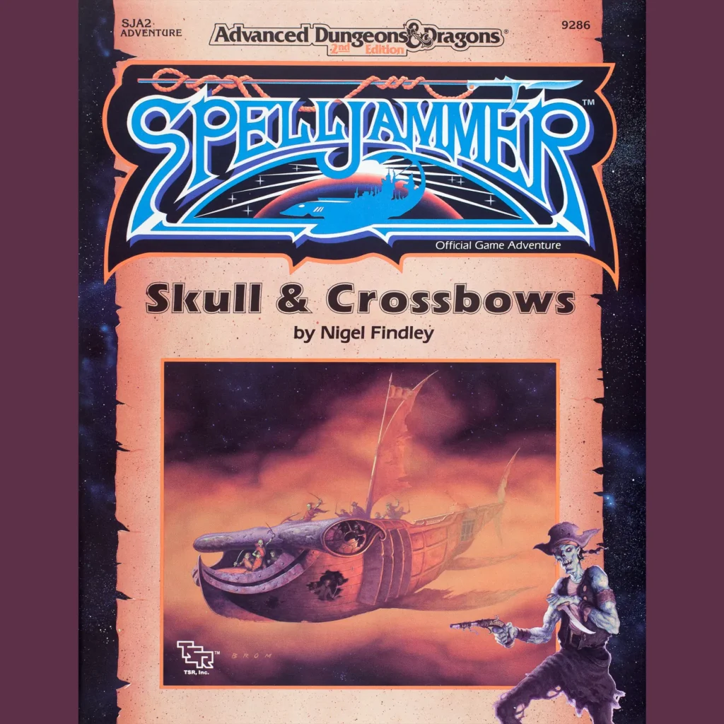 Skull & Crossbows (1990) is the second Spelljammer module and is a collection of short scenarios by Nigel Findley, unified by the theme of piracy. I’m always excited when I see Findley’s name on an RPG product! Somehow, he crams 19 scenarios into 64 pages! Fantastic cover by Brom — my favorite piece of Spelljammer art, I think — with a villain inset an undead pirate which could very well be by Brom, too. Paul Abrams is the interior artist; I like his bold, comic book-style ink work. He reminds me of Jeff Butler and I think the clean lines suit Spelljammer well.