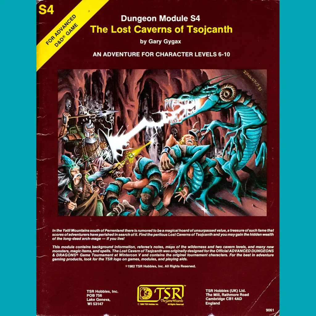 S4: The Lost Caverns of Tsojcanth (1982), it has been argued, is supposedly part of a large Greyhawk campaign that includes Hommlet (wait, what the fuck, I haven’t posted about Village of Hommlet?!? FUCK.), Temple of Elemental Evil and The Forgotten Temple of Tharizdun. And granted, there is a bunch of interesting Greyhawk lore scattered about and an event from Tsojcanth can lead to Tharizdun, but ultimately, I think the connection is overblown. YMMV.