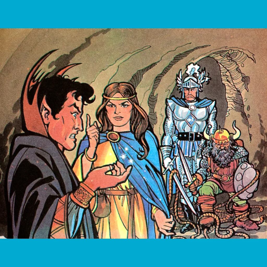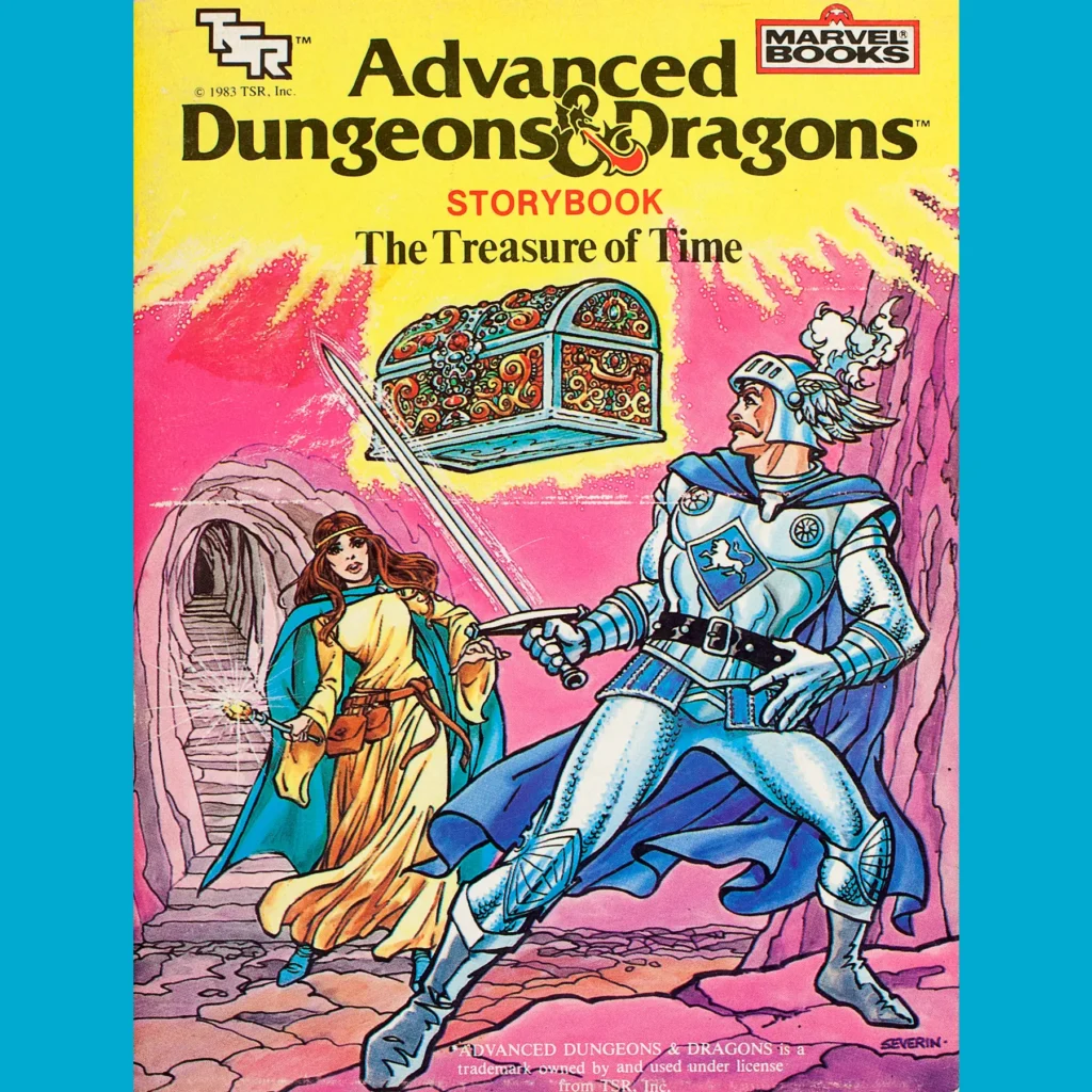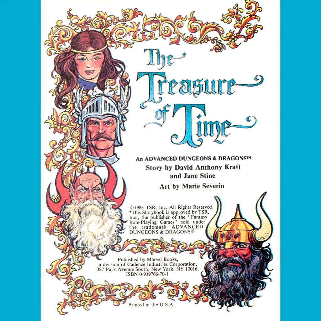 The Treasure of Time (1983) is the second of, I believe, only two storybooks produced in collaboration between TSR and Marvel Books, the other being The Forest of Enchantment. Both are tie-ins for the LJN line of D&D toys — this one features Strongheart, Elkhorn, Zarak, Kelek and a sorceress, Charmay. More on her in a minute.