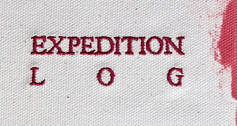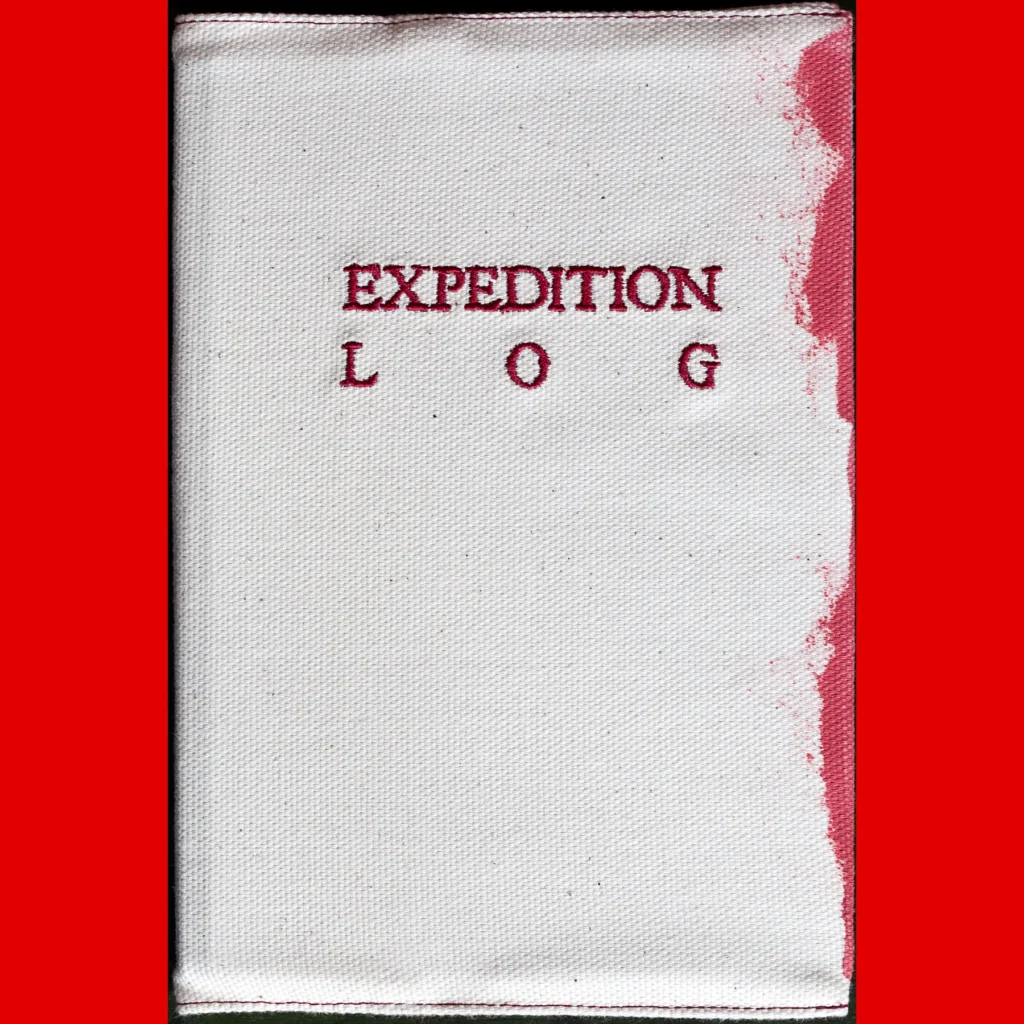 The book as a physical object is one of the most unusual I own. It’s coptic bound with raw boards tucked into a fabric wrap. The wrap is embroidered with the title and the open edge has been dipped in red ink, staining the cloth and the pages edges. Apparently, the original owner of the log (Wistedt, obviously) met a bad end on his quest to find the lost library. What follows is an illustrated travelogue.