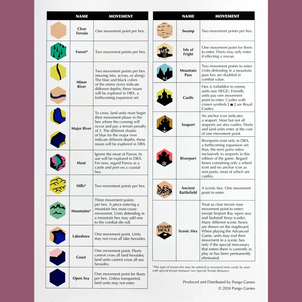 Thankfully, Pungo Games recently crowdfunded a modern remastered edition that tidies up the original art (with the exception of the box cover, which is a reimagining of the original by Ademir Leal) and rules, but upgrades the materials to contemporary standards. The original board was really a folded, laminated poster, for instance. This is a nice solid board. And these are about the nicest counters I’ve ever encountered. The whole thing is gorgeous and new, but feels old. The map is just fantastic, originally illustrated by Dave Trampier (and brought to new life by Barry Beadman) and I know it isn’t just me and my love of dusty old things. When the game arrived, I laid it out on the table and my kid saw it and just sank right into it, making up stories based on the counters and the names.