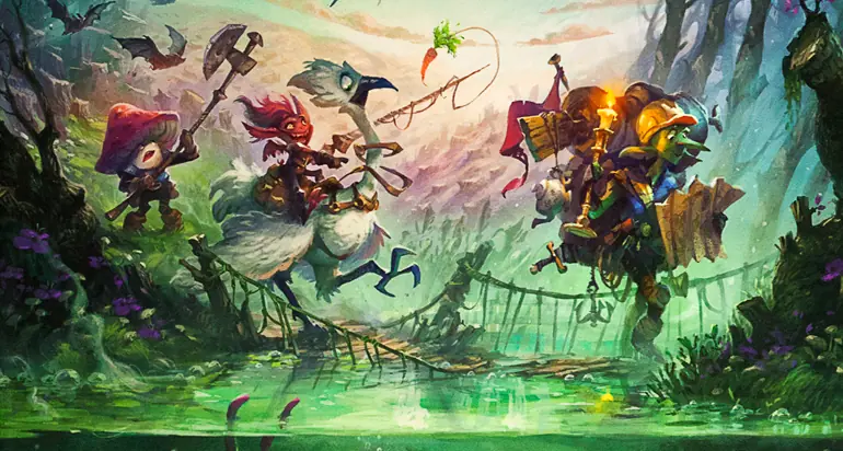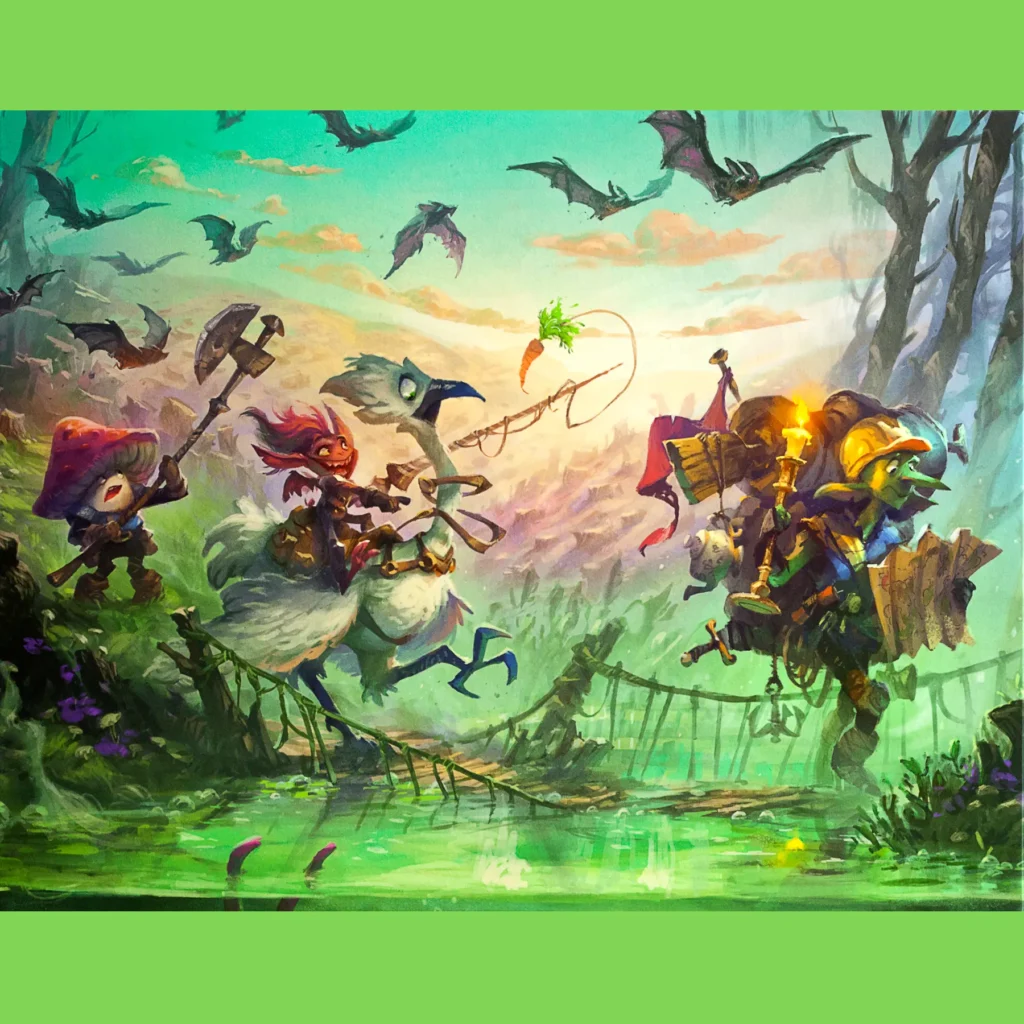 First, there’s a box labeled “Meeples, Dice and Adventuring Supplies.” If I bought the dice, they’d be in there, but I have enough dice. I did get the cattypillar patch and the meeples, though, so that’s where they live. The meeples are delightful? They aren’t something I would have sought out, but I am pleased to have them. I don’t know if there were plans for more stuff to stick in here, but the large empty space makes for a nice dice tray. Next is the screen, which is…surprise! A screen. It has all the stuff you expect on the screen, including a painting of a jaunty expedition into the Mucklands. Finally, there is the Mucklands Map. It’s a big fold-out board hex map of the Mucklands sandbox (see Thursday’s post) and it is a nice thing to have. I kind of wish I could get a Forbidden Lands map like this.