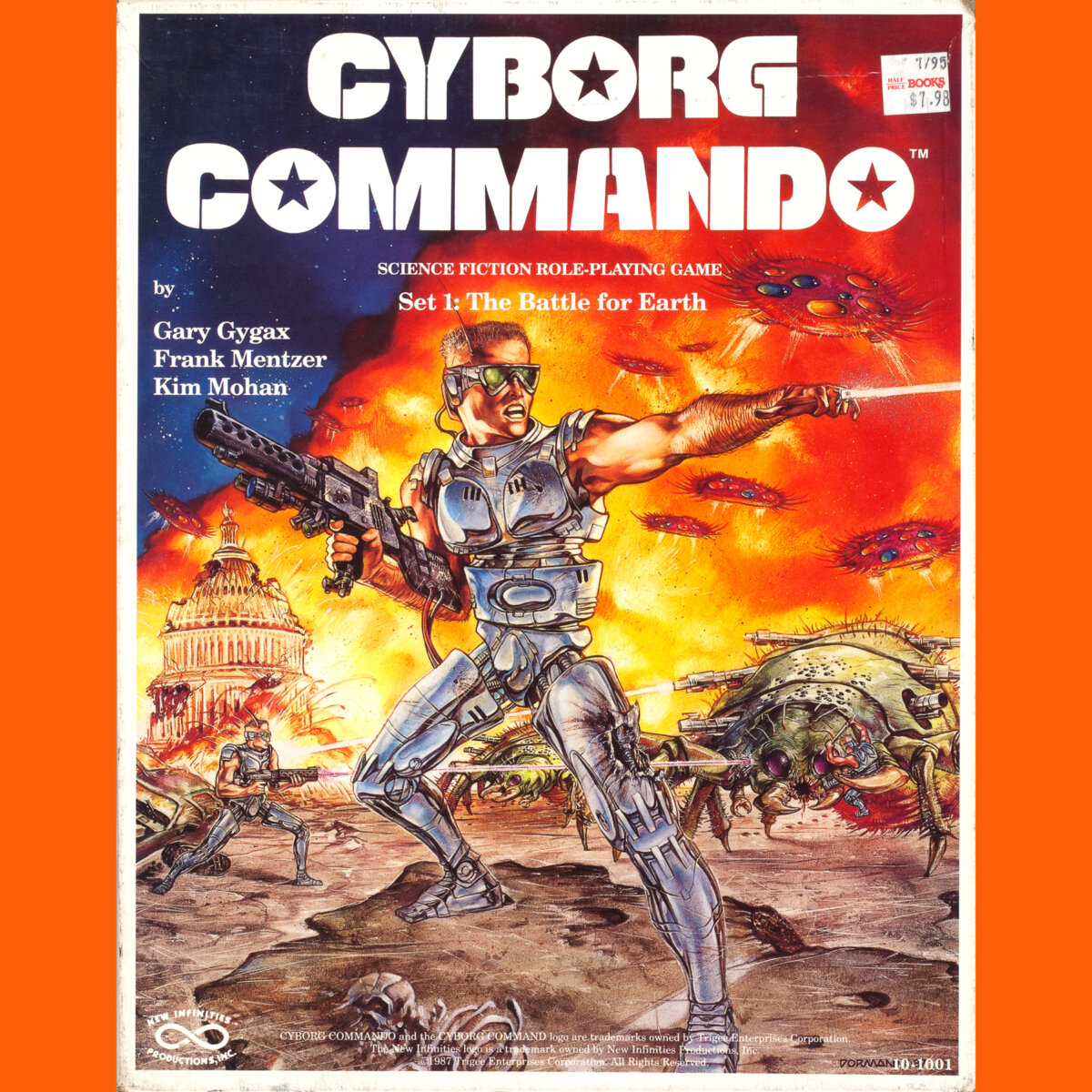 This week is loosely themed around cyborgs. We start with Cyborg Commando (1987). It was the first game from New Infinities, a company formed by Gary Gygax, Kim Mohan and Frank Mentzer after Gygax was run out of TSR. Gygax outlined the game, while Mohan and Mentzer designed it — Gygax was too busy writing the Gord the Rogue novels that were keeping the company afloat to do more than that. As it turns out, Cyborg Commando is a terrible game and released to become one of the biggest flops in the hobby’s history, which probably doomed New Infinities.