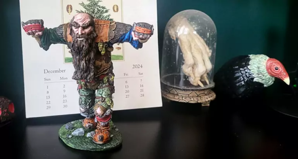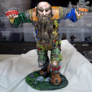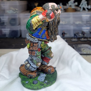 Problem one with the basecoat was the flesh. The speedpaint didn’t look fleshy at all, so I spent a long time trying to repair it and get a variety of human-looking tone out of it. I’m happy with how that turned out. Problem two was the dark leather. Too dark. Hated it. Wasn’t entirely sure I could fix it and was worried I’d fuck it up and have to start from scratch. Good news! I didn’t fuck it up! I did basically repaint it, though, with regular paint. The rawhide edges of both the dark and light leathers are probably my favorite part of the paint job. I did a bunch of other noodly highlight work, especially in the fur lining and the beard, but then I called it quits. I reach a point where I just get fearful that if I keep going, I’m going to ruin it. As it was, I accidentally peeled some paint of his ear and a boot just before I sprayed the fixative, ugh. Anyway, I wanted to do some stripes on the one part of his tunic but decided against it. The giant part of the Goblin War Giant is now, for my money, done. |