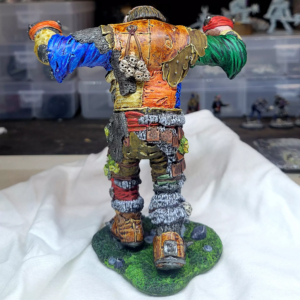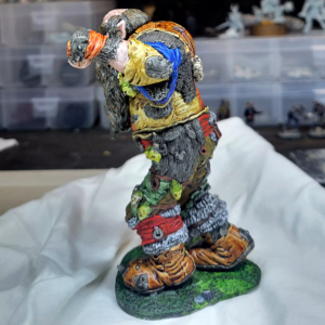 Took a little while to get back to the Goblin War Giant. When I stopped, I had most of the base coat done, just needed to do some straps and all the trophy heads, but man, the sheer surface area of the rest of the big guy up to that point took so long that I wasn’t really psyched to polish it off, because even though the last things were small, there were a lot of them. But I got there. Once I did, I was really off to the races.