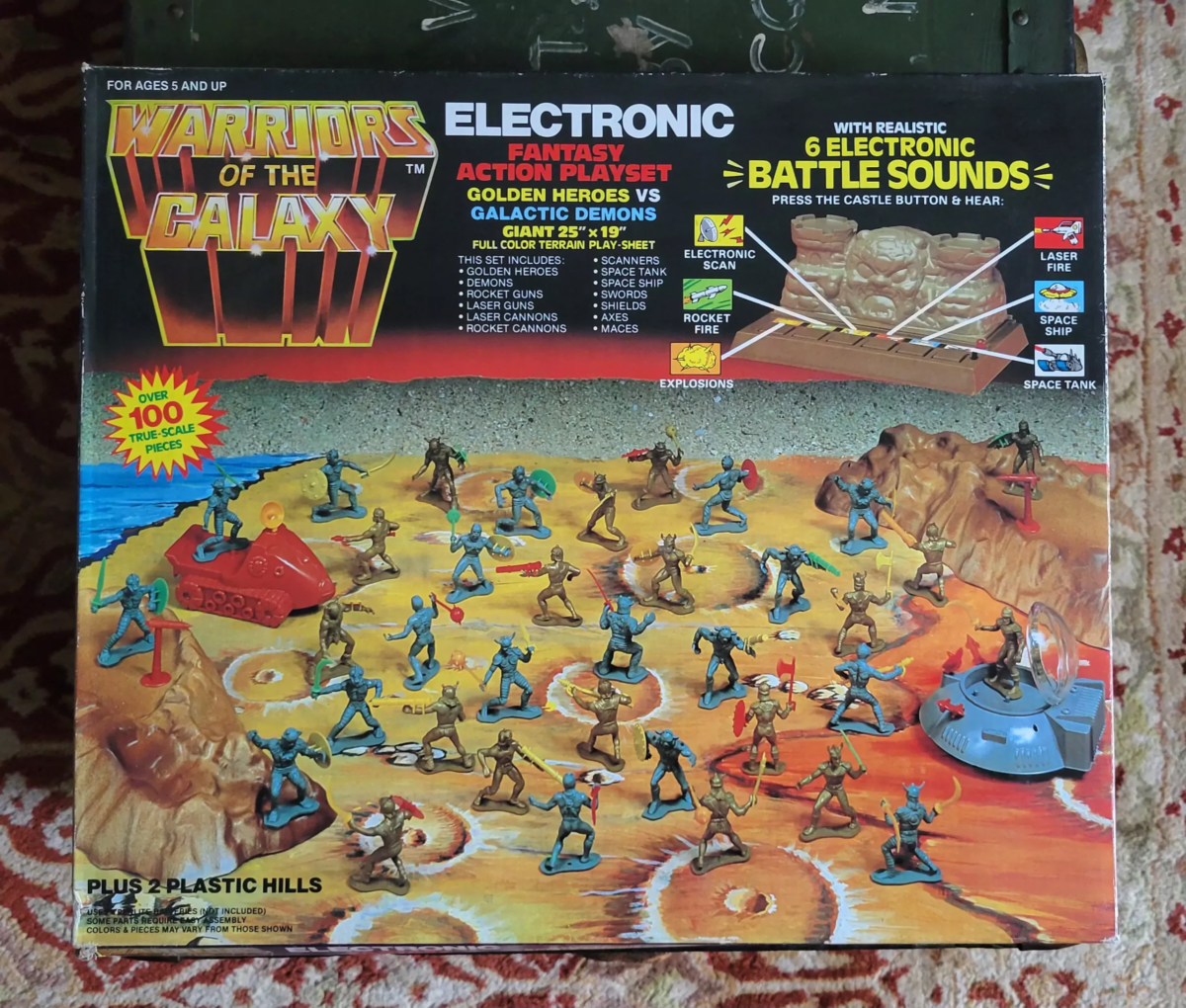 I'd have gone entirely nutso for this as a kid. In fact, I have to make sure I get it in the club house before my kid gets home and tries to claim it as his own. What a glorious thing, a clear knock-off of Masters of the Universe that fits perfectly in the fantasy toy resurgence going on at the time. I am endlessly amused by box copy like "Plus 2 Plastic Hills." What a treasure. |
