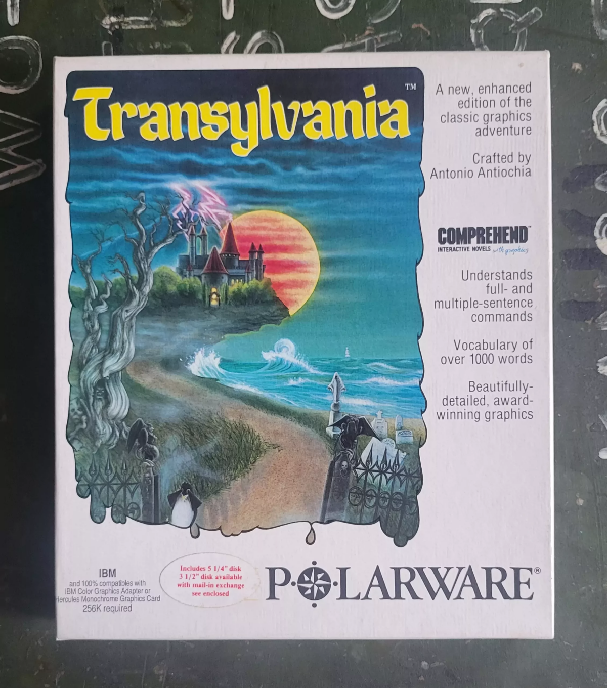Transylvania is a pretty small interactive text adventure accompanied by some fairly crude graphical "illustrations." The shadowy werewolf legitimately frightened me when I was seven, and I still feel an echo of that (similar to the hall monsters from Venture, actually, who still pop up in nightmares on occasion). The game came with two "feelies" as well: a letter exhorting you to save the kidnapped princess and a local newspaper filled with jokes. It's pretty great.