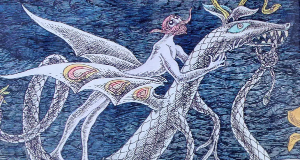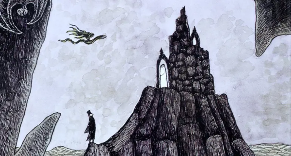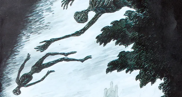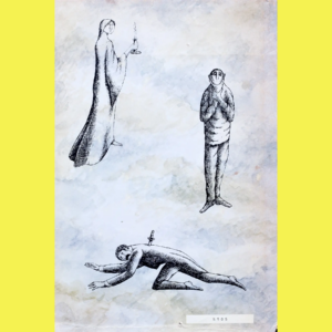 Anyway, that cover. Gorey makes such good choices. I love the gray watercolor background, the yellow glow, the hanged man as the focal point, but facing away from us, and one of Gorey’s trademark swooning women flying above the hand-lettered title. Atypically bright for Gorey, too, but that makes it strangely spectral, I think! |